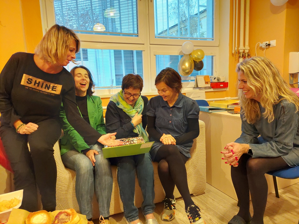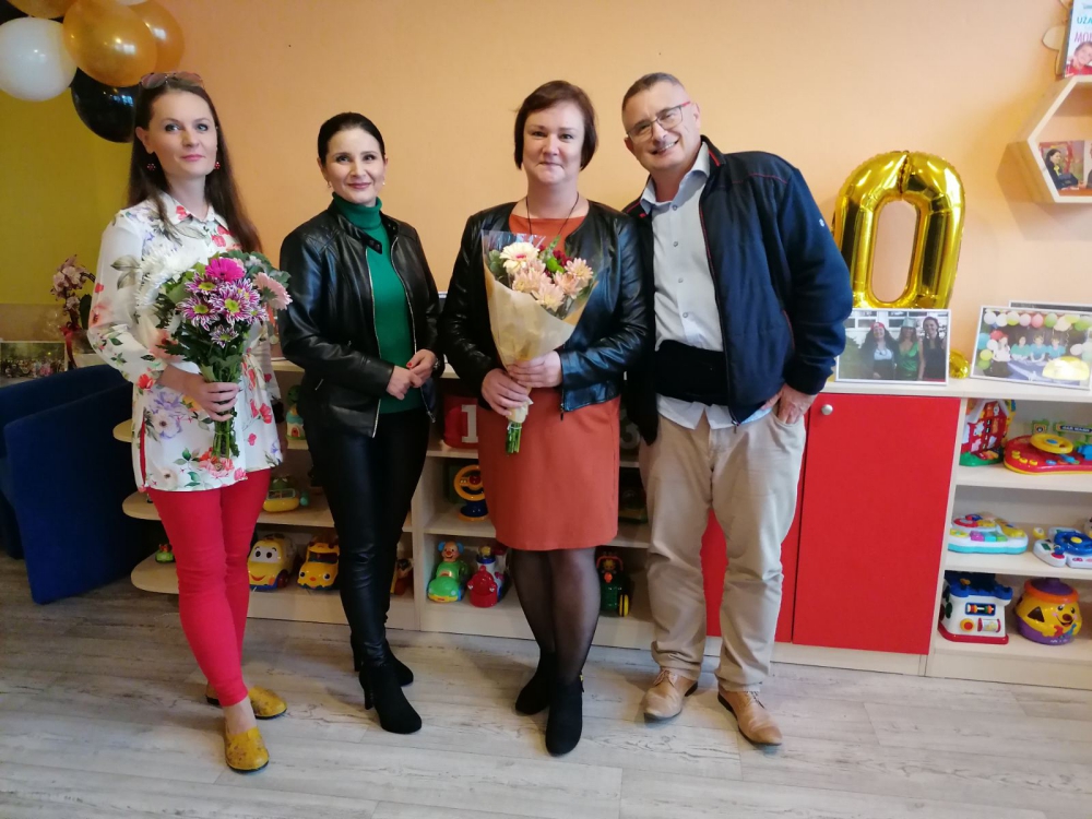 Ďakujeme Úradu práce, sociálnych vecí a rodiny v Piešťanoch, ktorý na oslave zastúpila a Ing. Sedláková za dlhoročnú podporu a pomoc. Bez dobrovoľníckej služby si nevieme predstaviť udržať prevádzku herne a niektorých aktivít Materského centra Úsmev. Ďakujeme aj za súčasných našich dobrovoľníkov – Ukrajinky, ktoré vnímame ako veľký prínos pre centrum. V spolupráci s Úradom práce sociálnych vecí a rodiny – Odborom sociálnych vecí sme zorganizovali nejednu zbierku detského oblečenia, hračiek a detských potrieb pre sociálne odkázané rodiny.