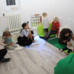 Hneď pri vstupe ich privítala príjemná vôňa šíriaca sa zo svetelného difuzéra. Očarilo ich množstvo rôznych svetiel v miestnosti. Zahrali sa na čarodejnice so svetelnou guľou, pozorovali ako sa mení láva v lampe či vzniká bublinkové tornádo. Prostredníctvom množstva hmatových pomôcok sa učili rozoznávať jemnosť či drsnosť povrchov.