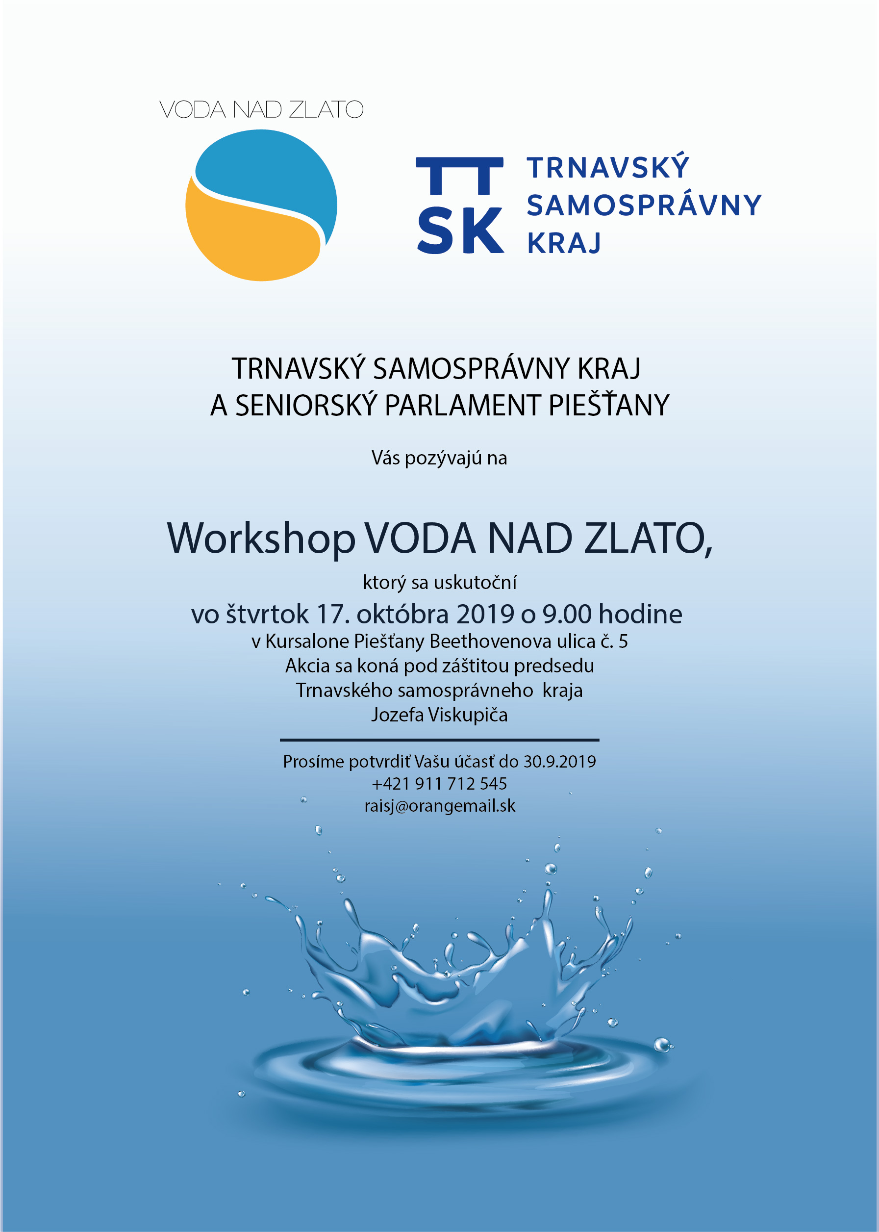 Workshop Voda nad zlato, ktorý organizuje Seniorský parlament Piešťany, sa koná pod záštitou župana Jozefa Viskupiča a je financovaný z participatívneho rozpočtu TTSK. Uskutoční sa vo štvrtok 17. októbra v piešťanskom Kursalone. Hlavným odborným garantom podujatia je uznávaný klimatológ Prof. RNDr. Milan Lapin, PhD. Účastníci podujatia sa v dvoch blokoch dozvedia, prečo treba zadržiavať zrážkovú vodu a následne akým spôsobom. Na podujatí sa predstavia odborníci z rôznych oblastí. Spoločne návštevníkov uvedú do témy, ale rovnako sa pokúsia ozrejmiť možnosti riešenia problémov.