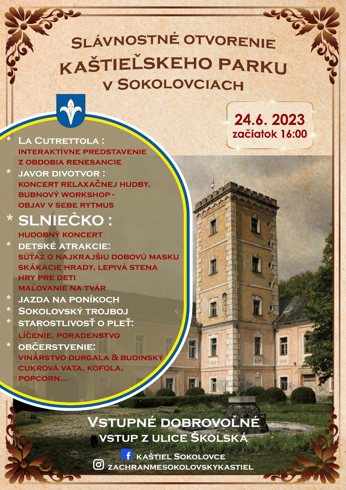 V sobotu 24. júna sa v Sokolovciach uskutoční slávnostné otvorenie kaštieľskeho parku. Pripravený je bohatý program. Začiatok je naplánovaný na 16:00, kedy sa uskutoční slávnostné otvorenie.