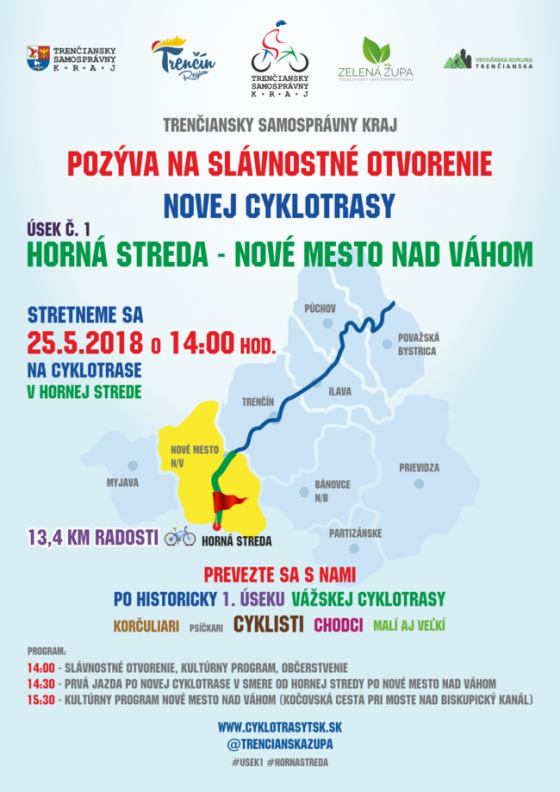 „S hrdosťou môžeme konštatovať, že prvý úsek Vážskej cyklotrasy je takmer hotový. Trenčiansky samosprávny kraj preto pozýva nielen cyklistickú verejnosť, ale aj korčuliarov, kolobežkárov, chodcov či bežcov, psičkárov, rodiny s deťmi, malých, veľkých, aj tých skôr narodených, aby prišli v piatok 25. mája 2018 prvý úsek cyklotrasy slávnostne otvoriť. Všetkých srdečne privítame o 14.00 h priamo na cyklotrase v obci Horná Streda, aby sme hromadnou prvou jazdou po cyklotrase v smere na Nové Mesto nad Váhom cyklotrasu symbolicky odovzdali širokej verejnosti. Na slávnostnom otvorení v obci Horná Streda nebude chýbať kultúrny program, symbolické odhalenie tabule na cyklotrase, no ani občerstvenie a v neposlednom rade významní hostia, cyklisti, a cyklistické zoskupenia. Príde autor myšlienky cyklotrasy vedúcej naprieč celým krajom župan Jaroslav Baška, národný cyklokoordinátor Peter Kľučka, zástupcovia obcí, ktoré cyklotrasa spája, ako aj zamestnávatelia a firmy, ktoré sa na trase cyklotrasy nachádzajú,“ pozývajú predstavitelia kraja.
