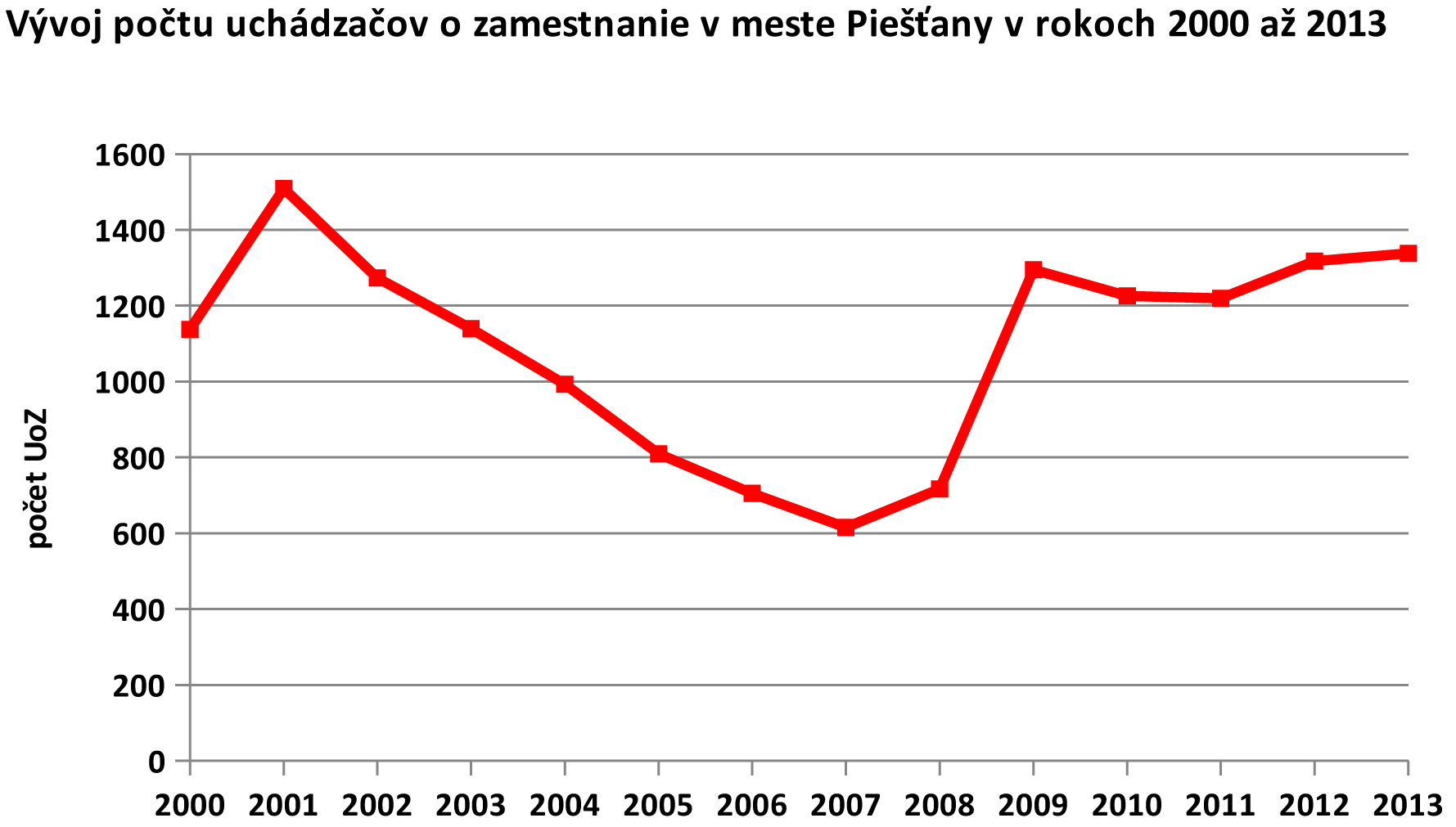 Aj keď Piešťany nepatria medzi mestá s extrémne vysokou mierou nezamestnanosti, tento fenomén výrazne ovplyvňuje život jeho obyvateľov. Podľa dostupných údajov zo Štatistického úradu SR a Úradu práce, sociálnych vecí a rodiny, dosahuje v súčasnosti mie-ra nezamestnanosti medzi obyvateľmi okresu Piešťany približne 8 %. Vývoj celkového počtu uchádzačov o zamestnanie (UoZ) v meste Piešťany znázorňuje nasledujúci graf.