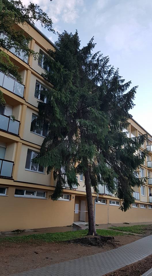 Po nápore vetra povolil koreňový systém stromu a mohutný smrek sa oprel o budovu. Pracovníci Služieb mesta Piešťany no museli spíliť.
