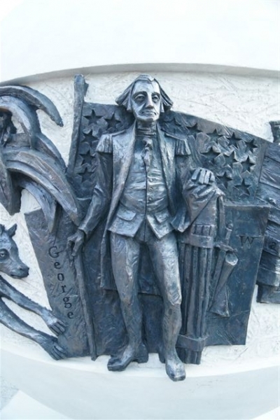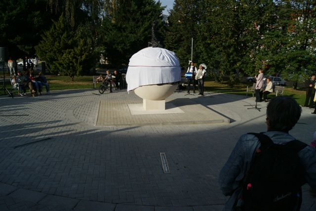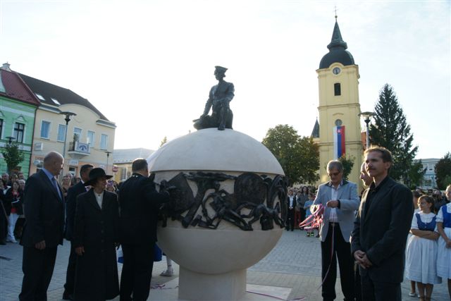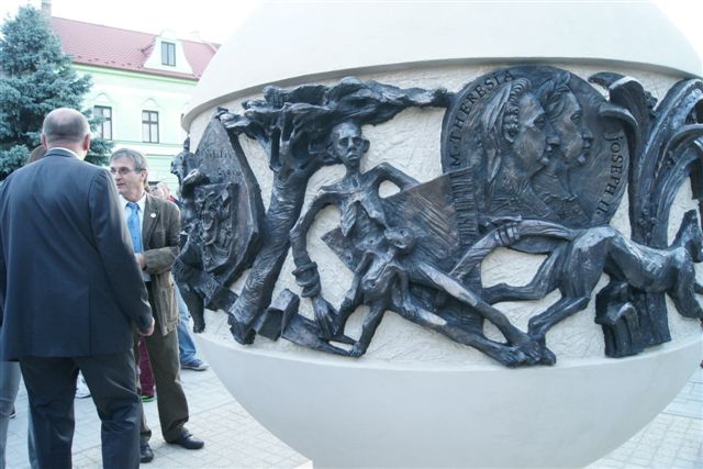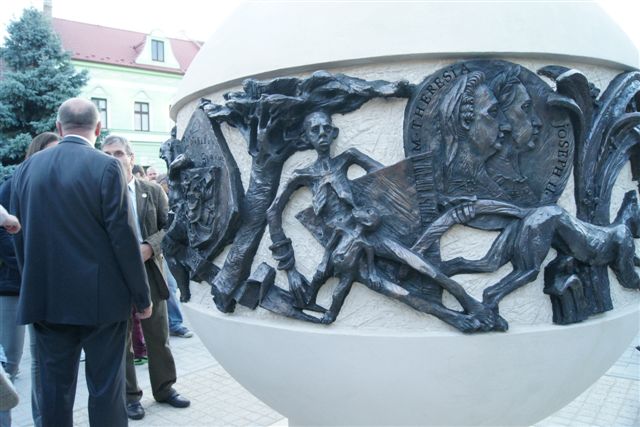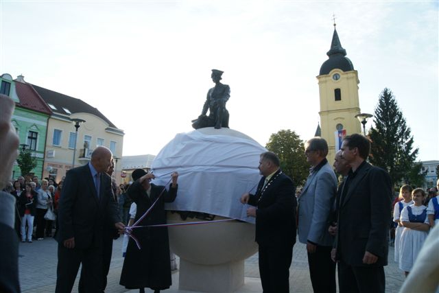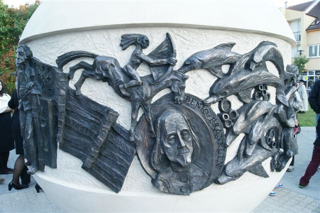 Móric Beňovský sedí na zemeguli s bronzovým reliéfom zobrazujúcim momenty z jeho života. Sochu, ktorú financoval konateľ tamojšej firmy odhalili vo Vrbovom 5. októbra.