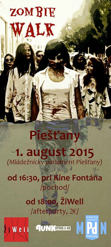 Mládežnícky parlament Piešťany pripravil na sobotu 1. augusta netradičné podujatie, takzvaný Zombie walk. Pochod živých- mŕtvych organizujú nadšenci filmov žánru zombie po celom svete a ich hlavnou náplňou je skupinová zábava. Slabšie povahy by si mali dať na sprievod pozor a radšej sa zadebniť doma. Účastníci bývajú totiž často desivo zamaskovaní, vydávajú podivné zvuky, majú na sebe dotrhané oblečenie, pôsobia akoby boli vážne zranení a určite bude k videniu aj falošná krv. S pochodom by mali počítať aj rodičia, aby ich deti neboli zbytočne traumatizované.