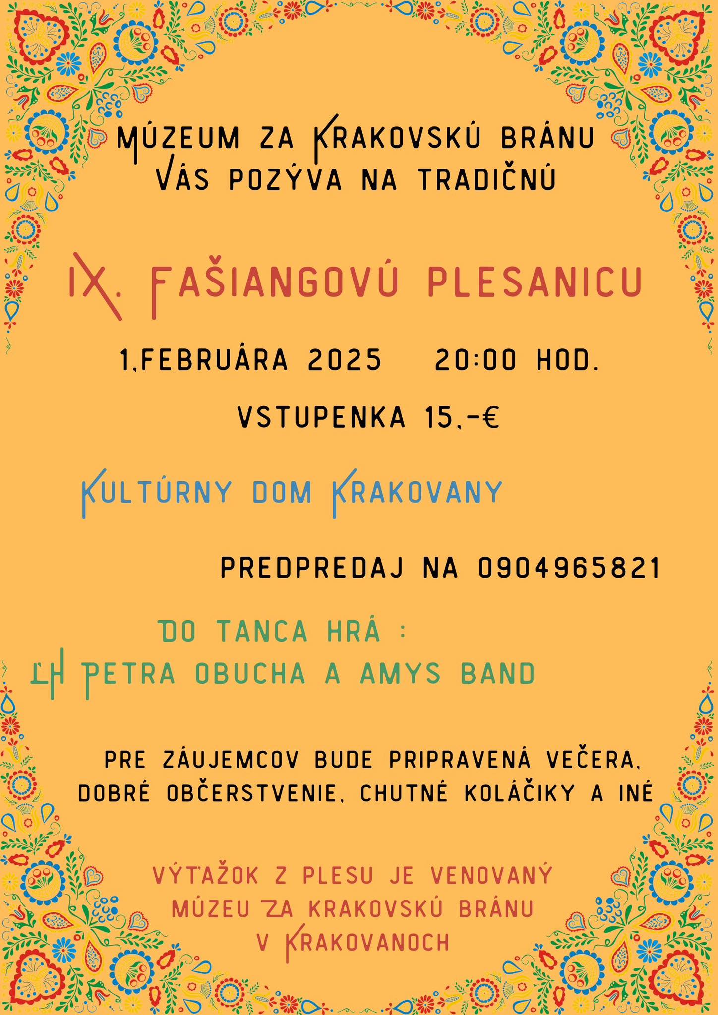 Do tanca hrá Ľudová hudba Petra Obucha a AMYS Band. Pre záujemcov bude pripravená večera, dobré občerstvenie, chutné koláčiky a iné dobroty.