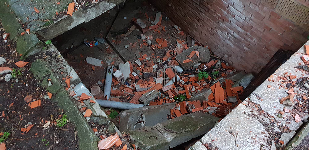 Podľa fotografií, ktoré sme dostali od nášho čitateľa, sa diera zväčšuje každým rokom. Miesto, ktoré sa prepadlo, si niekto pretvoril na prírodnú posilňovňu. Svedčí o tom hrazda na stene. Očitý svedok tvrdí, že zo stavby padajú tehly a práve tie spôsobili prepadnutie betónového prekrytia do pivnice. Objekt nie je nijako zabezpečený ani osvetlený. Voľne sa okolo neho pohybujú deti z domov na Červenej veži i turisti. Nebezpečný môže byť predovšetkým večer a v noci, keď poriadne nevidíte kam kráčate.