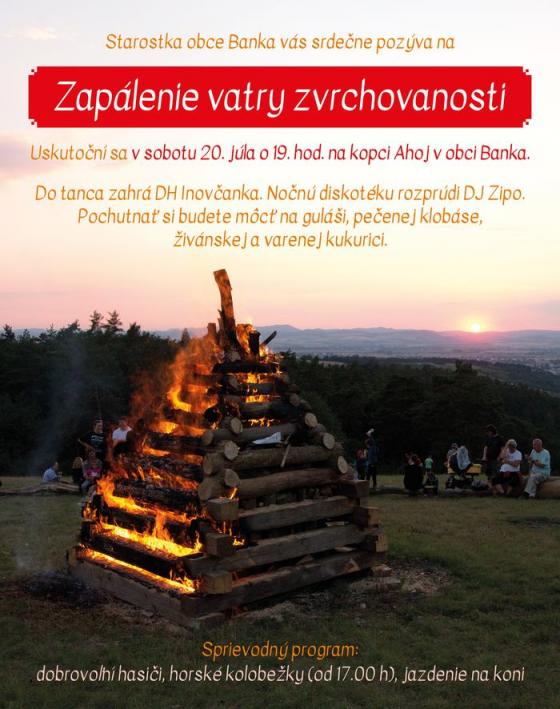 Obecný úrad Banka vás srdečne pozýva v sobotu 20. júla o 19:00 hod. na kopec Ahoj, kde sa uskutoční Zapálenie vatry zvrchovanosti. Záujemcovia si budú môcť od 15:00 do 18:00 hod. vyskúšať jazdu na horských kolobežkác i jazdu na koni. Sprievodné akcie zabezpečia dobrovoľní hasiči. Do tanca zahrá dychová hudba Inovčanka a DJ Zipo. O občerstvenie bude postarané.