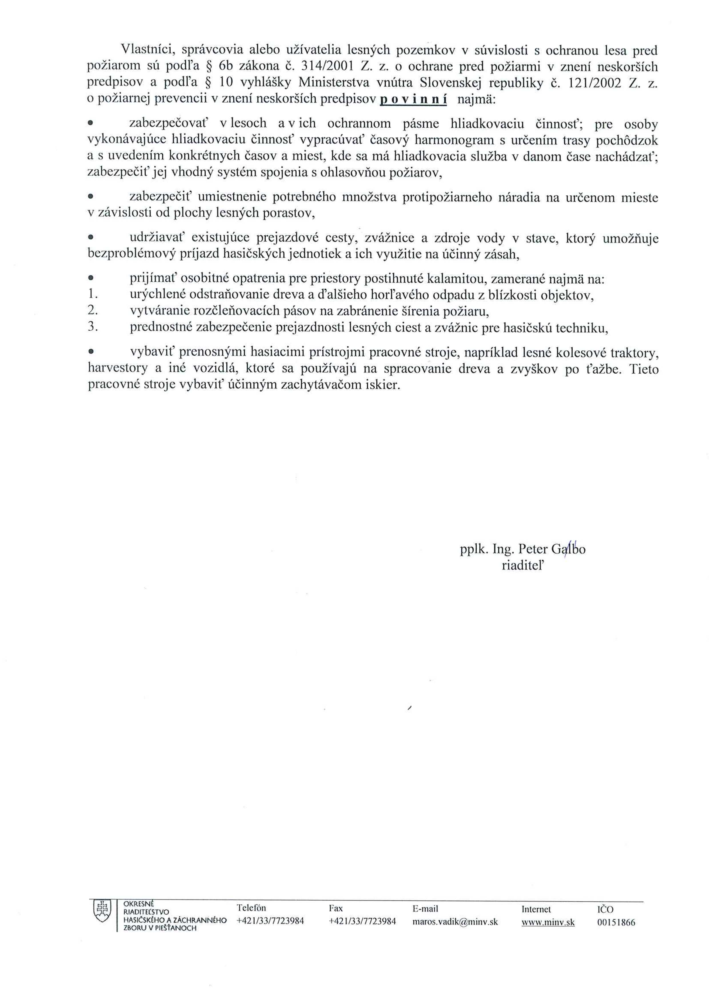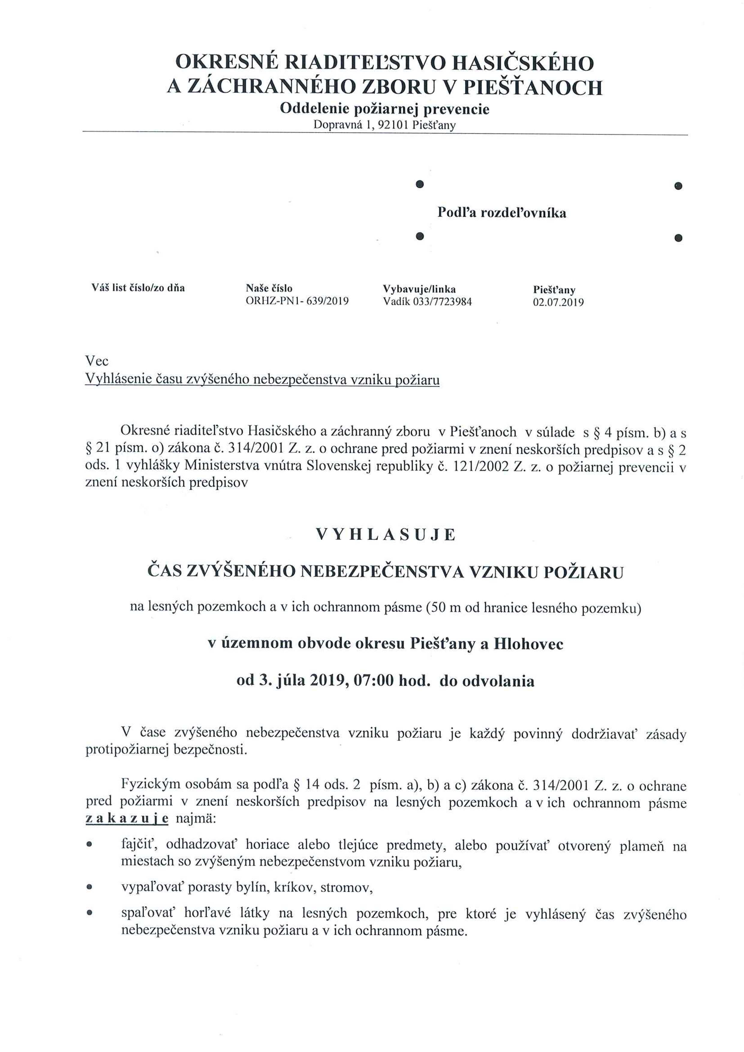 Hasiči v piešťanskom okrese vyhlásili od 3. júla až do odvolania čas zvýšeného nebezpečenstva požiaru. Na lesných pozemkoch a v ich ochranných pásmach je zakázané fajčiť a používať otvorený plameň na miestach so zvýšeným nebezpečenstvom vzniku požiaru. Pri porušení zákazov a zákonných povinností hrozí previnilcom pokuta v stovkách až tisícoch eur.