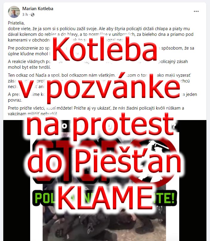 Ostrými vyjadreniami nešetrí Marian Kotleba. Ten v nedeľu 7.11. novembra zverejnil post, v ktorom pozýva ľudí na účasť na zhromaždení pred sídlom policajtov v Piešťanoch. Majú prísť ukázať, že ich žiadni policajti kvôli rúškam a vakcínam mlátiť nebudú. Kotleba v pozvánke zavádza a klame, pričom sa snaží vyeskalovať napätie v spoločnosti. Jeho výstup v Piešťanoch nebude prvým. Už po predošlých antirúškarských protestoch sa zrazu objavuje, zatiaľ neprávoplatne odsúdený politik, ako záchranca národa a spravodlivosti.
