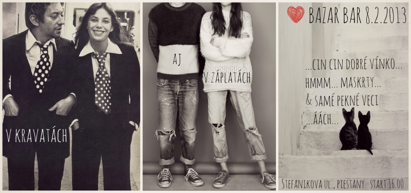 Už zajtra – piatok 8. februára sa uskutoční druhý Bazar Bar. Opäť pôjde o akciu “obývačkového” charakteru (s ľahko predvalentínskou tématikou). Na Štefánikovej ulici, v budove vedľa pražiarne kávy, od 16:00 h do 20:00 h. Iba jeden deň, iba pár hodín.