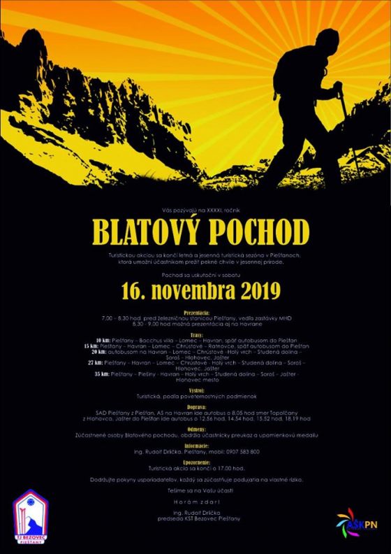 V sobotu 16. novembra sa opäť uskutoční Blatový pochod. Bude to už 41. ročník tohto podujatia, ktorým sa tradične končí letná a jesenná turistická sezóna v Piešťanoch. Vďaka blatovému pochodu môžete stráviť príjemné chvíle v lesoch Považského Inovca.