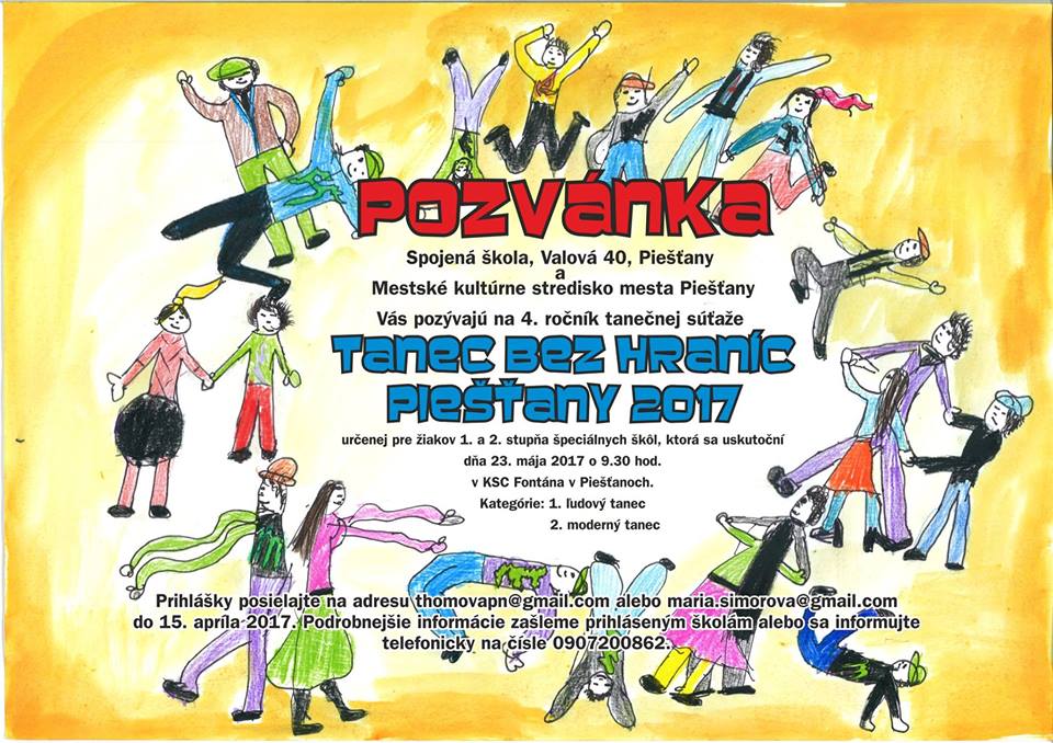 Kultúrno-spoločenské centrum Fontána zažije 23. mája 4. ročník tanečnej súťaže Tanec bez hraníc. Podujatie organizuje Spojená škola na Valovej ulici a Mestské kultúrne stredisko mesta Piešťany, určené je pre všetky deti z 1. a 2. stupňa špeciálnych škôl. Príďte sa pozrieť na tanečné umenie handicapovaných detí a mládeže, súťažné kategórie sú rozdelené na ľudový a moderný tanec. Ako vždy príde aj špeciálny hosť, minulý rok ním bol známy slovenský tanečník Laci Strike.