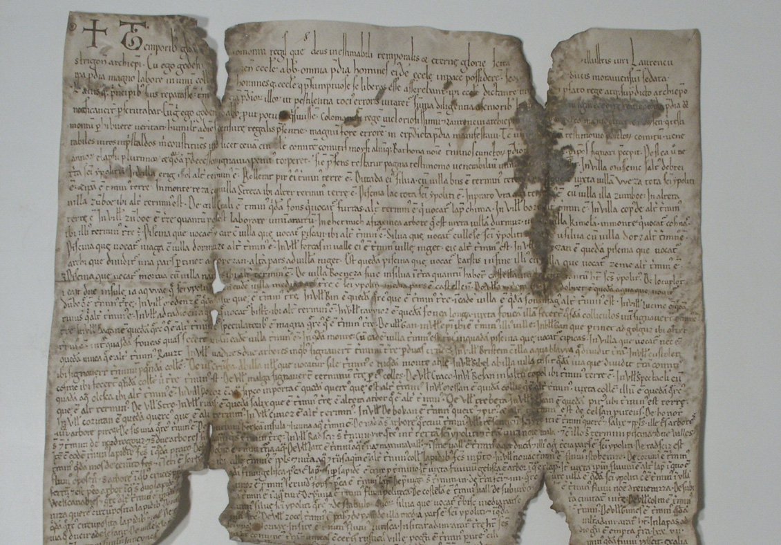 V samostatnej miestnosti je možné vidieť exponáty viažuce sa k prvej písomnej zmienke o Piešťanoch. V tejto časti expozície si návštevníci môžu pozrieť vernú kópiu – faksimile Zoborskej listiny z roku 1113 s najstarším názvom Piešťan „vila Pescan“, ďalej pečatidlá a vývoj obecného symbolu Piešťan od vyobrazenia svätého Štefana na najstarších pečatiach po súčasný mestský erb s takzvaným barlolámačom.