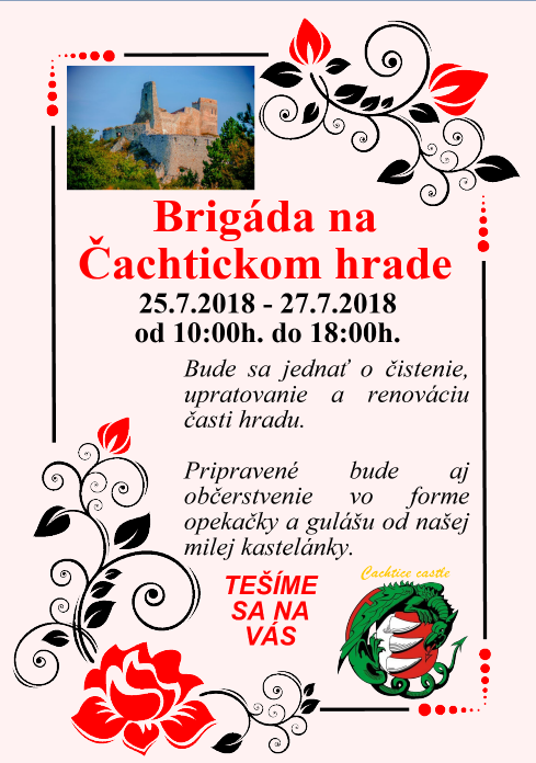 O dva týždne od 25.7.2018 do 27.7.2018 chystajú na hrade brigádu. Dobrovoľníci, ku ktorým sa môžete pridať budú čistiť priestory hradu a renovovať niektoré časti. Za odmenu je pripravená opekačka a guláš.