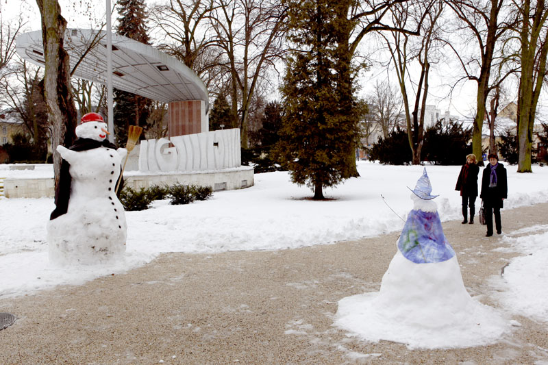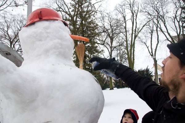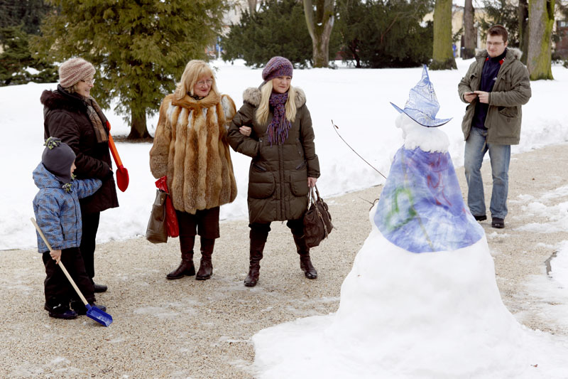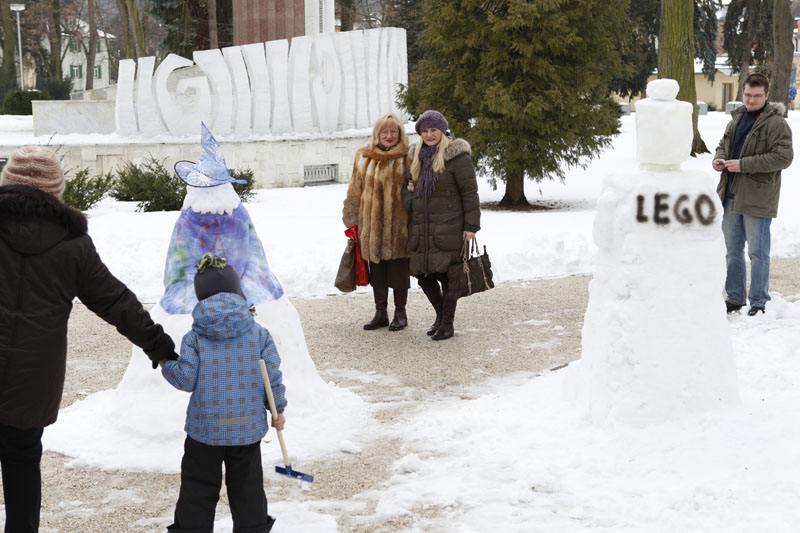 „Snehuliak, ktorého sme postavili, napokon nie je až taký maxi, ako sme plánovali. Má necelé tri metre. Chceli sme urobiť ešte väčšieho, ale ťažký mokrý sneh nám to nedovolil. Stavali sme totiž gúľaním gúľ a nie navršovaním snehu lopatami. Mokrý sneh bol príliš ťažký, a tak bol problém dostať základnú spodnú guľu na miesto a na ňu zodvihnúť ďalšie dostatočne veľké,“ povedal Radovan Pagáč z OZ Pro Civitate. Stavania chtivých rúk bol nadbytok, preto pri veľkom snehuliakovi vyrástli dvaja menší a vďaka šikovným rukám Martiny Schmidovej a jej pomocníkom pribudla aj ježibaba a panáčik z lega. Snežné bytosti hneď po dostavaní budili záujem okoloidúcich, ktorí sa pri nich zastavovali a fotili si ich.
