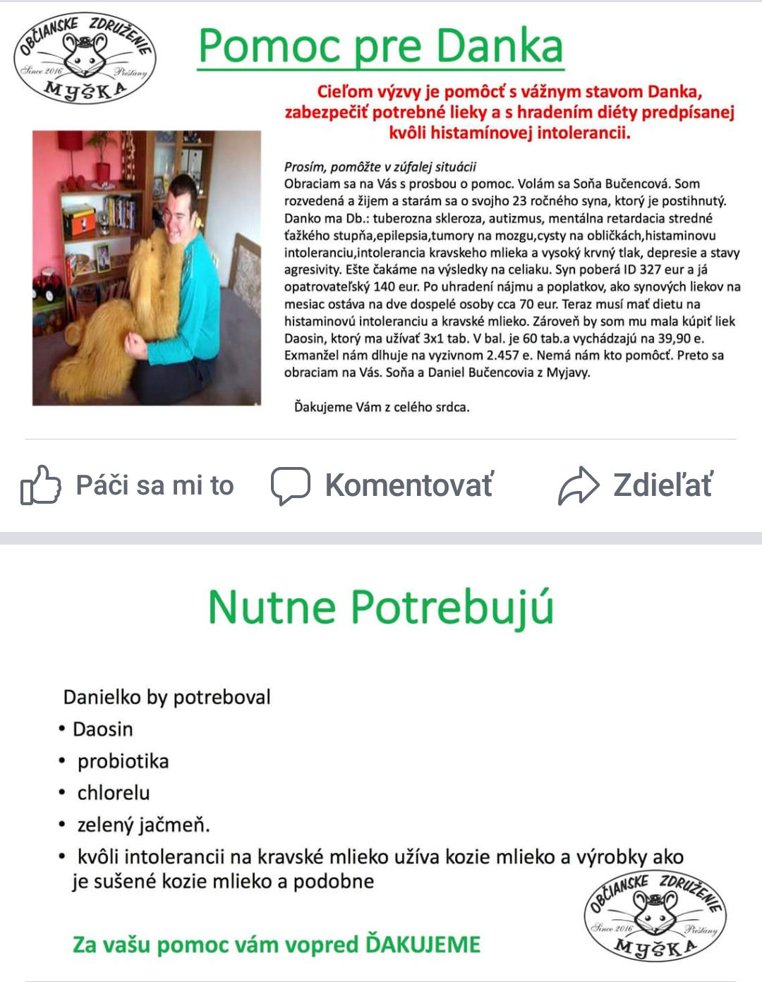 Danko Bučenec je 23-ročný mladý muž, ktorý trpí viacerými diagnózami. Problémy sa mu darí len s ťažkosťami prekonávať s pomocou starostlivej mamy. Diagnostikovanú má tuberkulóznu skleróza, autizmus, mentálnu retardáciu stredne ťažkého stupňa, epilepsiu, tumory na mozgu, cysty na obličkách, histamínovú intoleranciu,intolerancia kravského mlieka a vysoký krvný tlak, depresie a stavy agresivity. Ak by ste chceli Danka podporiť, ale nestihnete podujatie, môžete sa tak urobiť prostredníctvom portálu ludialudom.sk.