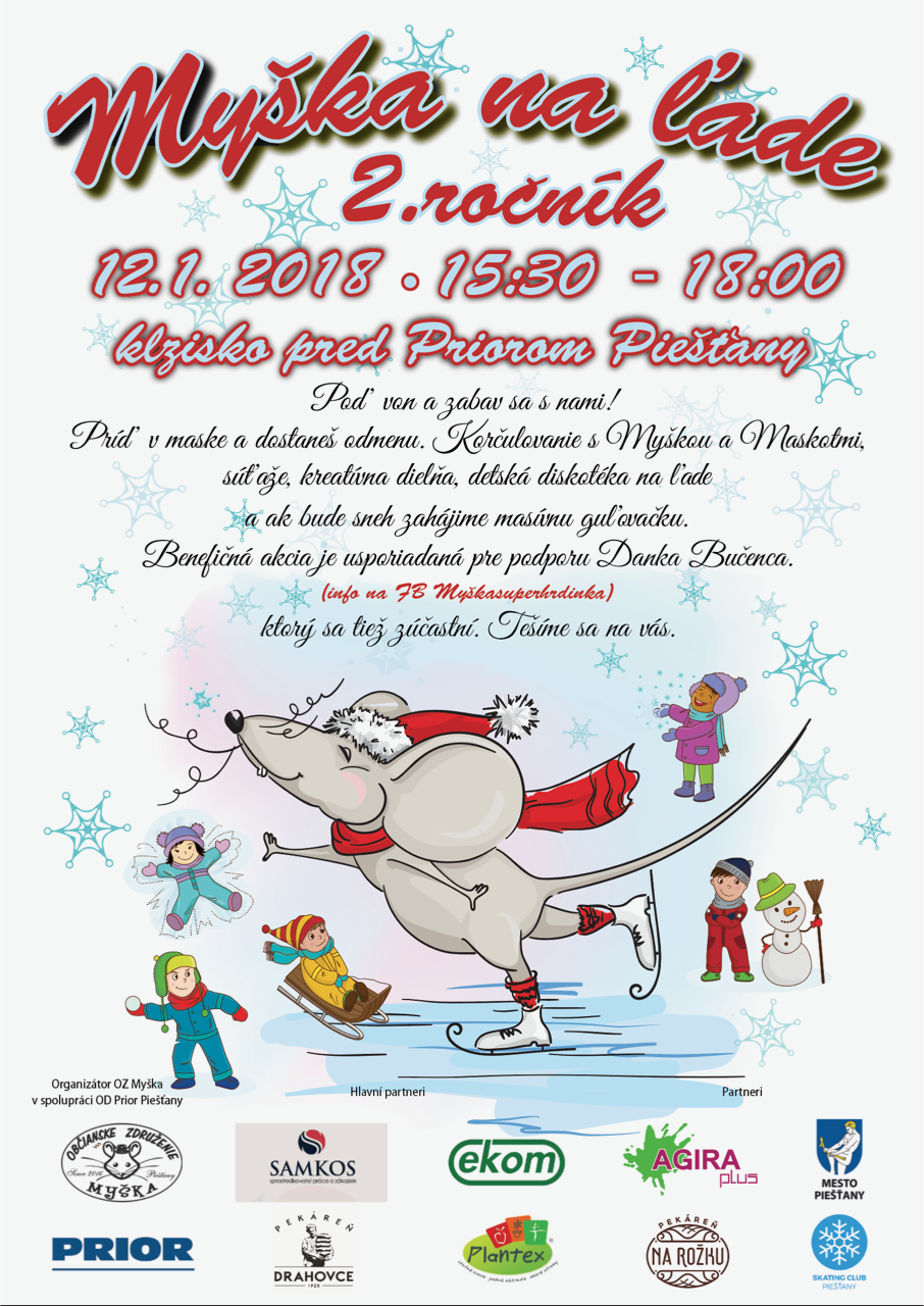 Mobilná ľadová plocha pred obchodným domom Prior bude v piatok 12. januára dejiskom benefičnej akcie „Myška na ľade“, ktorá bude určená pre všetkých malých aj veľkých korčuliarov, nekorčuliarov i krasokorčuliarov. Návštevníci podujatia sa môžu tešiť na hudobný program s maskotmi, balóny, maľovanie na tvár, voňavý čaj, veľa súťaží a vystúpenie dievčat zo Skating Club Piešťany. Výťažok navyše pomôže dobrej veci, poputuje totiž na pomoc pre Danka Bučenca z Myjavy. Myška poteší deti v čase od 15.30 do 18.00 hodiny.