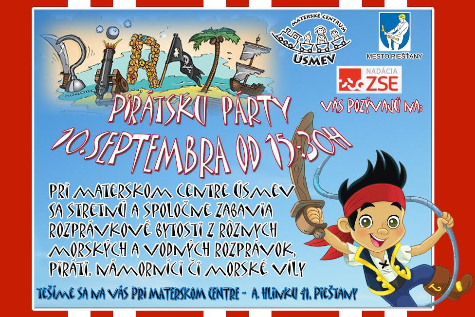 Slnko už stráca na sile, rána sú chladnejšie. Z prázdnin sa stali len spomienky, ktoré začínajú blednúť. Prečo si však leto nepredĺžiť a nepridať zopár nových zážitkov, nespoznať zopár nových kamarátov. Materské centrum Úsmev v Piešťanoch vám to všetko ponúka na svojej tradičnej akcii Pirátskej párty, ktorá sa koná v sobotu 10.9.2016 o 15:30 na detskom ihrisku „Karibik“ pred sídlom Materského centra Úsmev na A. Hlinku 39/41, Piešťany. Podujatie sa koná za každého počasia.
