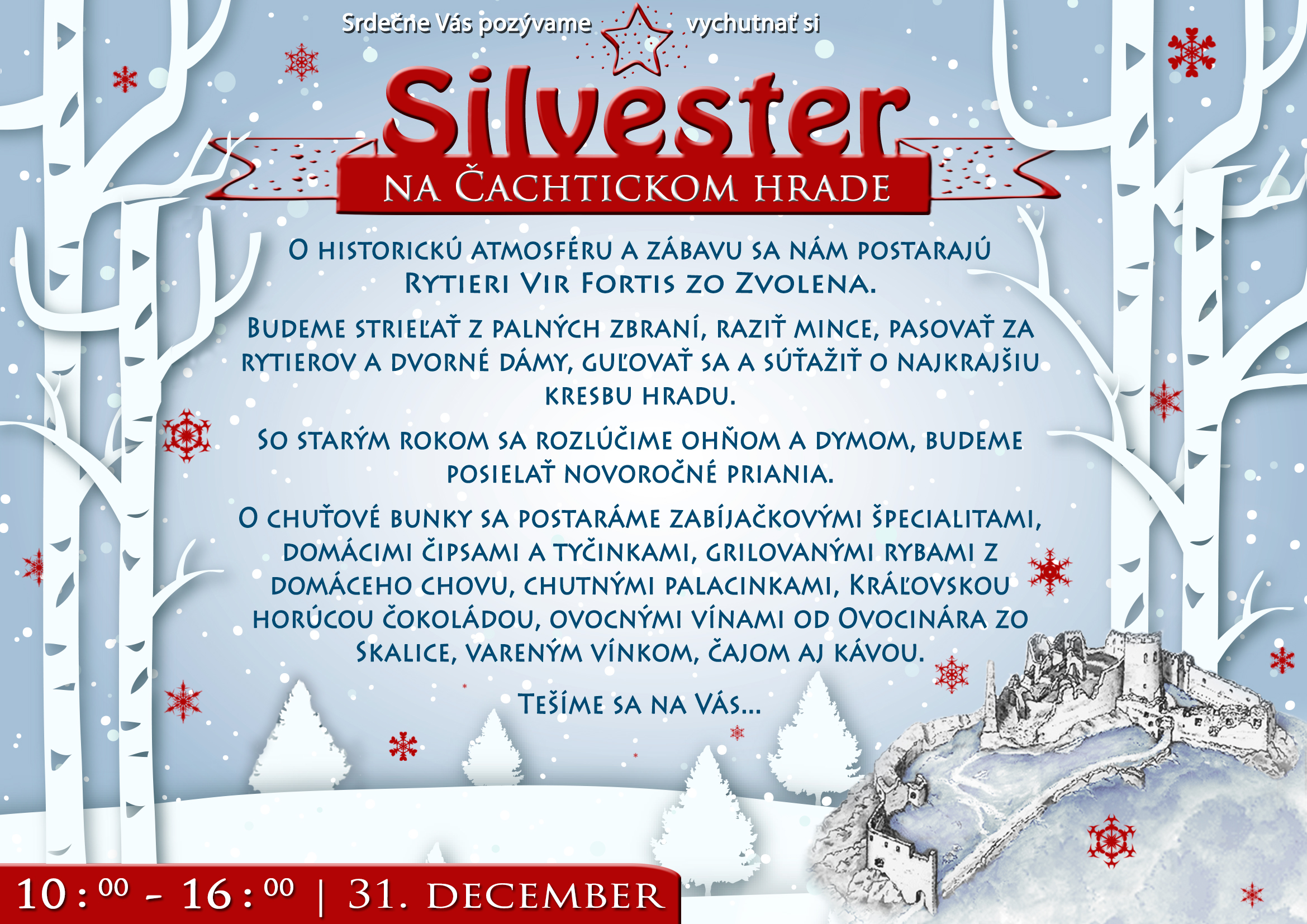 Vychutnajte si silvestrovský deň na Čachtickom hrade. O historickú atmosféru a zábavu sa postarajú rytieri Vir Fortis zo Zvolena, chystá sa ohňová a dymová rozlúčka so starým rokom, ale budete si môcť tiež pochutiť na zabíjačkových špecialitách či grilovaných rybách, alebo palacinkách.