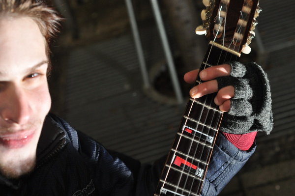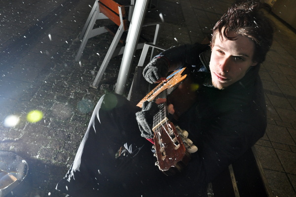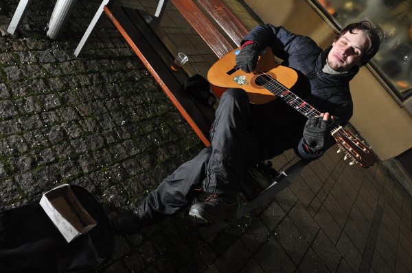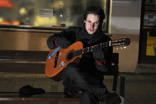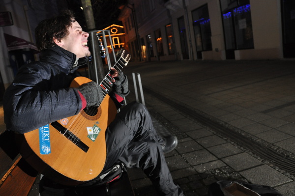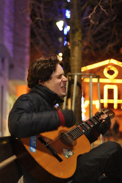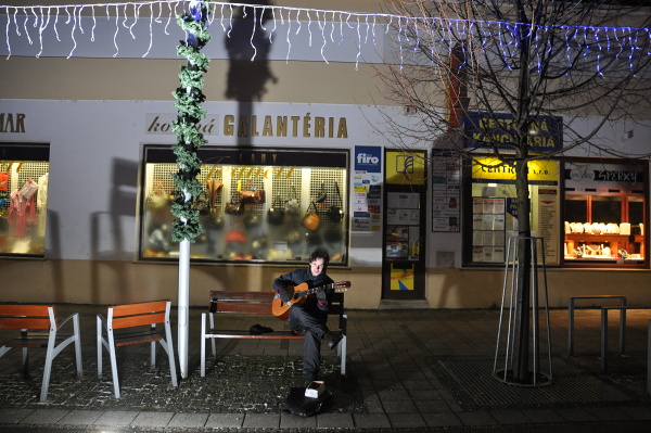 Počas jedného z uplynulých decembrových večerov prekvapil chodcov v centre mesta hlasný spev a tóny päť strunovej gitary.