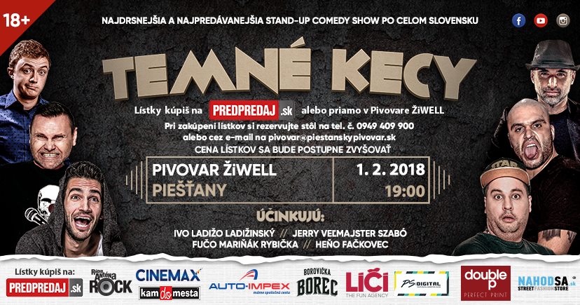 Piešťanský pivovar ŽiWell bude vo štvrtok 1. februára dejiskom ďalšieho jedinečného vystúpenia stand-up komikov, vypočuť si budete môcť Temné kecy. Od nekorunovaných kráľov slovenského humoru, ktorými bezpochyby sú Ivo “Ladižo” Ladižinský, Jerry “Veľmajster” Szabó a Fučo “Mariňák” Rybička, si vypočujete komické príhody zo života. Návštevníkov čaká štipľavý humor bez servítky, vtipné postrehy, ale aj rozoberanie celospoločenských tém. Ak sa chcete poriadne zabaviť, v prvý februárový deň si určite naplánujte návštevu pivovaru, vystúpenie začína o 19.00 hodine a je prístupné od 18 rokov.