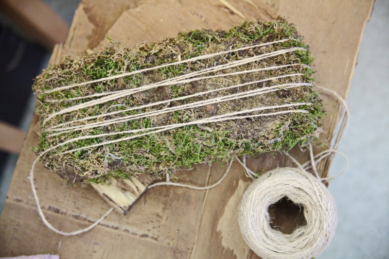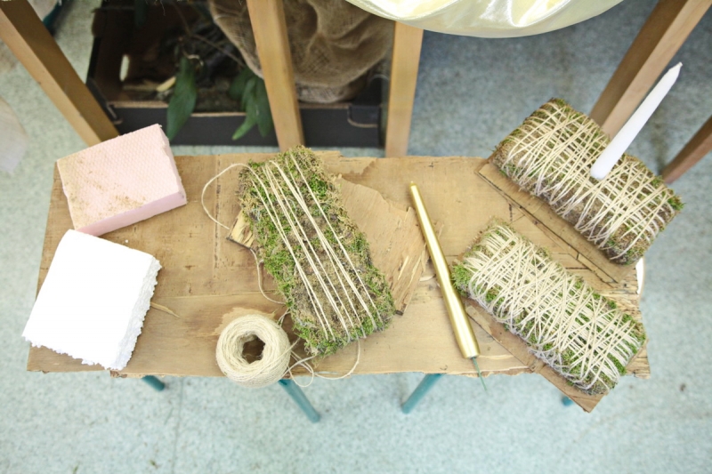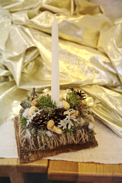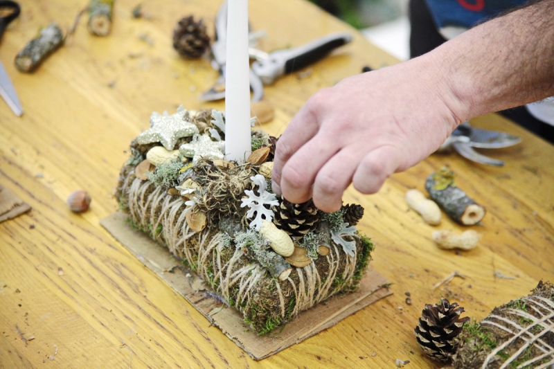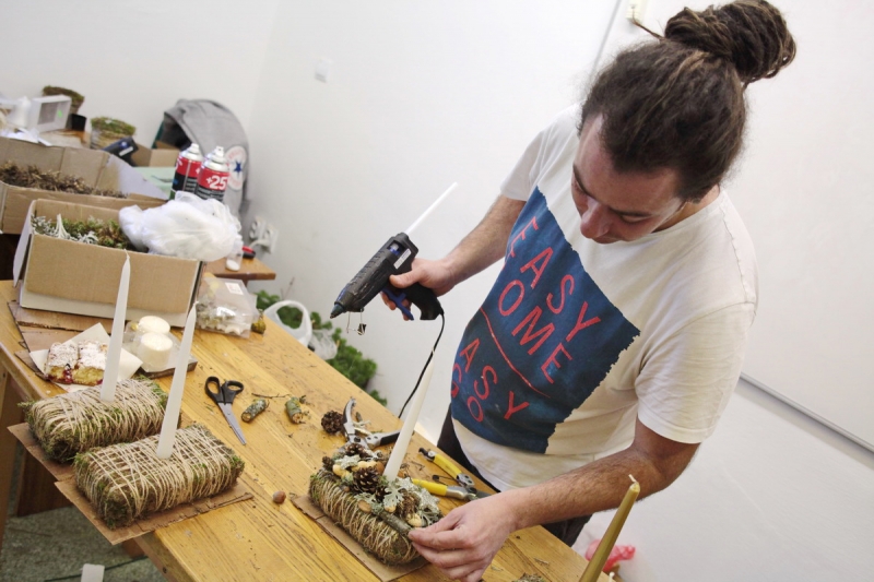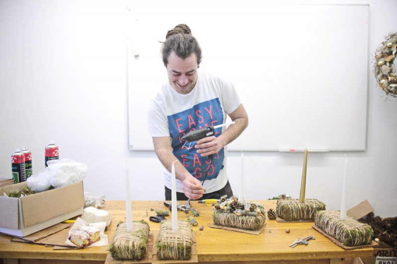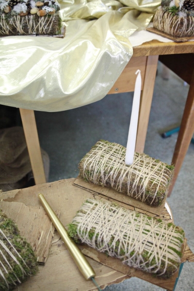 Patriko Komár nám vysvetlil, ako postupuje pri výrobe svietnika. Všetko začína prípravou materiálu potrebného na jeho základňu, ktorým môže byť napríklad styrodur alebo polystyrén. Ďalšou vrstvou je mach zafixovaný špagátom a takto pripravená spodná vrstva je upevnená na kôru prípadne preglejku.