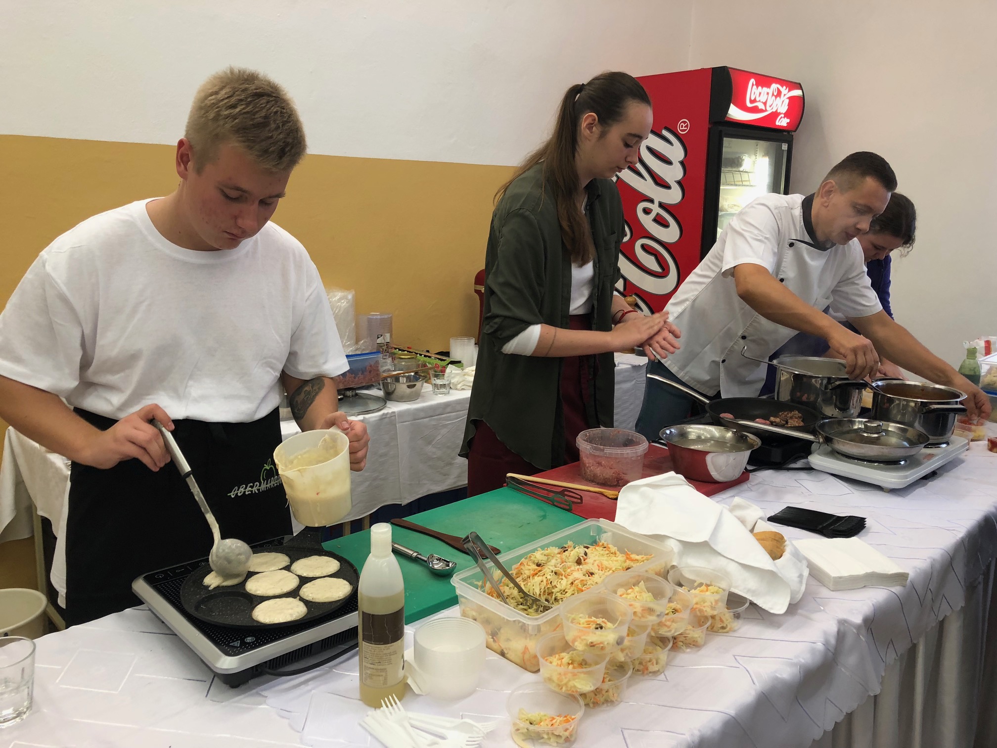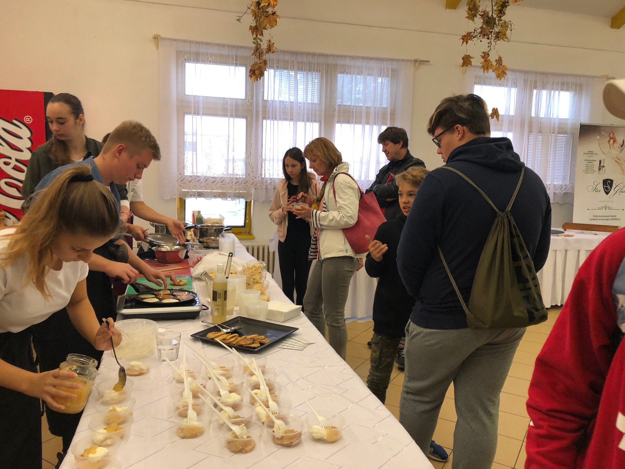 Ďalšia možnosť teplého občerstvenia bola v slávnostne vyzdobenej školskej jedálni, kde žiaci odboru manažment regionálneho cestovného ruchu Natália Jankechová, Jaroslava Talianová, Natália Teličiaková a Jaroslav Samohýl pripravovali talianske gnocchi s rajčinovým ragú, polpety – placky z mletého mäsa so šalátom Coleslaw a lievance s ovsenými vločkami s tvarohovou penou a jablkovým čatní pod vedením profesionálneho kuchára Mária Ivanoviča, ktorý pôsobí ako šéfkuchár vo Viedni. Asistovali mu aj počas gastronomickej show, kde návštevníkom predviedol prípravu náročnejšieho jedla. Hostia si mohli tiež pochutnať na ovocných dezertoch, ktoré priniesli do súťaže gazdinky z okolia. Tradičné remeslá predstavili košikár p. Zeman z Durcech doliny a p. Kozáková z Rakovíc, ktorá piekla voňavé oblátky.