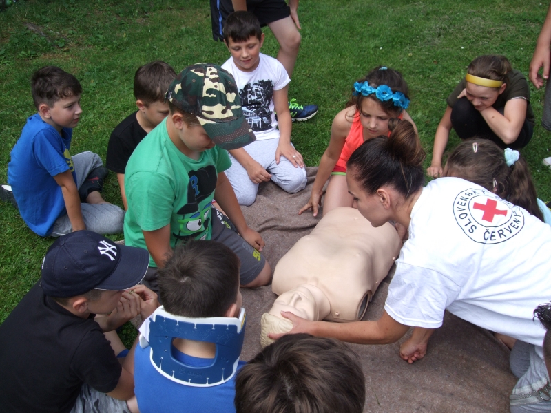 Tábor sme začali praktickými ukážkami pracovníkov Červeného kríža z Považskej Bystrice, ktorí nás naučili, ako dávať prvú pomoc, či už umelé dýchanie, obviazanie rany, balenie do termoizolačnej fólie, uloženie zraneného do stabilizovanej polohy. Všetko si deti samé vyskúšali a obstáli na jednotku. Počasie nám doprialo urobiť zopár peších výletov po okolí. Okrem lesných cestičiek sme preskúmali aj Belušské Slatiny, kde sa nachádzajú tri pramene v priamej blízkosti, síričitý, železitý a kyselka, čo sme si aj vyskúšali.