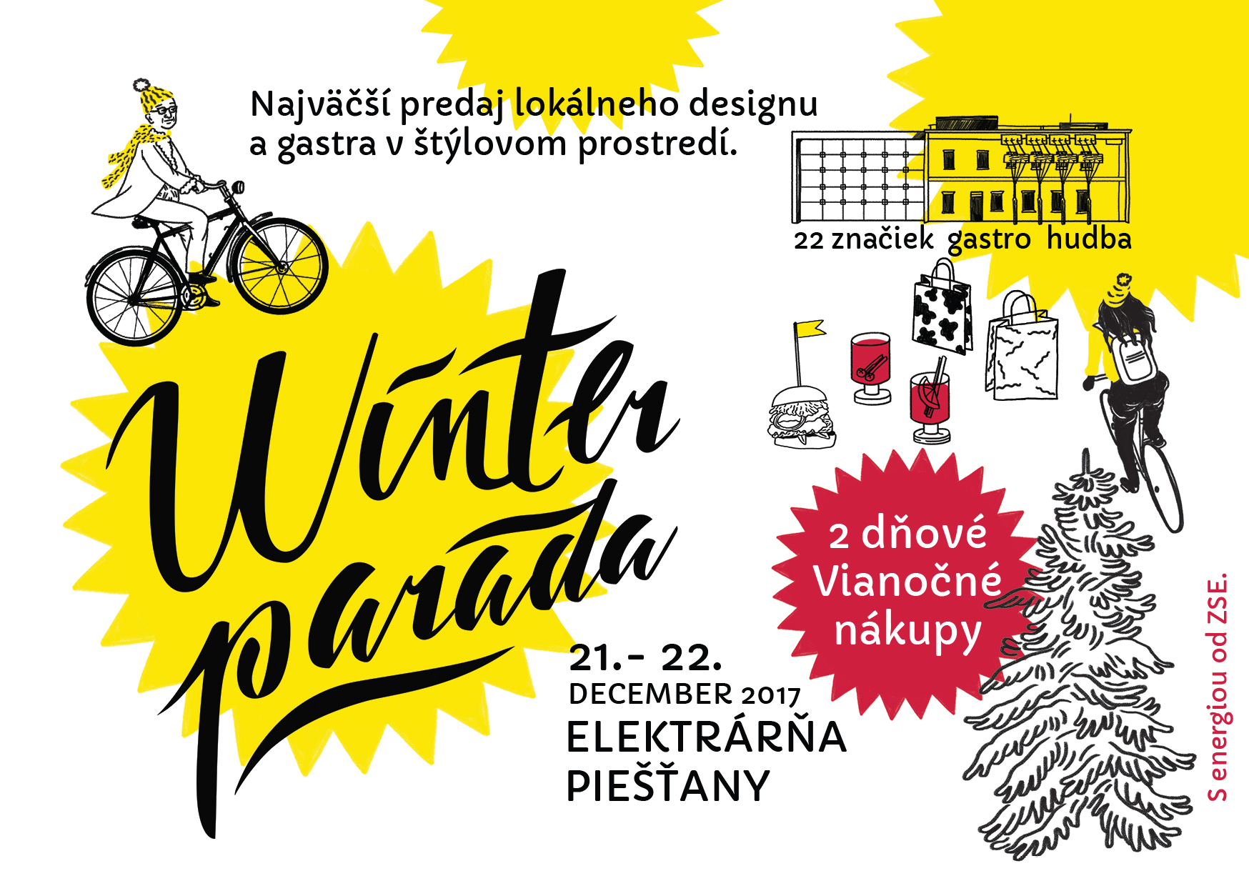 Tesne pred Vianocami sa v Piešťanoch uskutoční prvý ročník predajného festivalu Winterparáda. Podujatie odštartuje vo štvrtok 21. decembra o 15:00 h. Návštevníci si budú môcť naplno vychutnať príjemnú predvianočnú atmosféru s kvalitným grogom, či vareným vínkom v ruke. V ponuke je 22 lokálnych predajcov, ktorí budú rozmiestnení v hlavnej sále unikátnej Elektrárne Piešťany. Na dvore a v bočných priestoroch budú k dispozícii kvalitné gastro prevádzky. Kto bude mať záujem prezrieť si súčasné trendy v ilustrácii, alebo si len posedieť pri dobrej káve, môže tak urobiť v galérii.