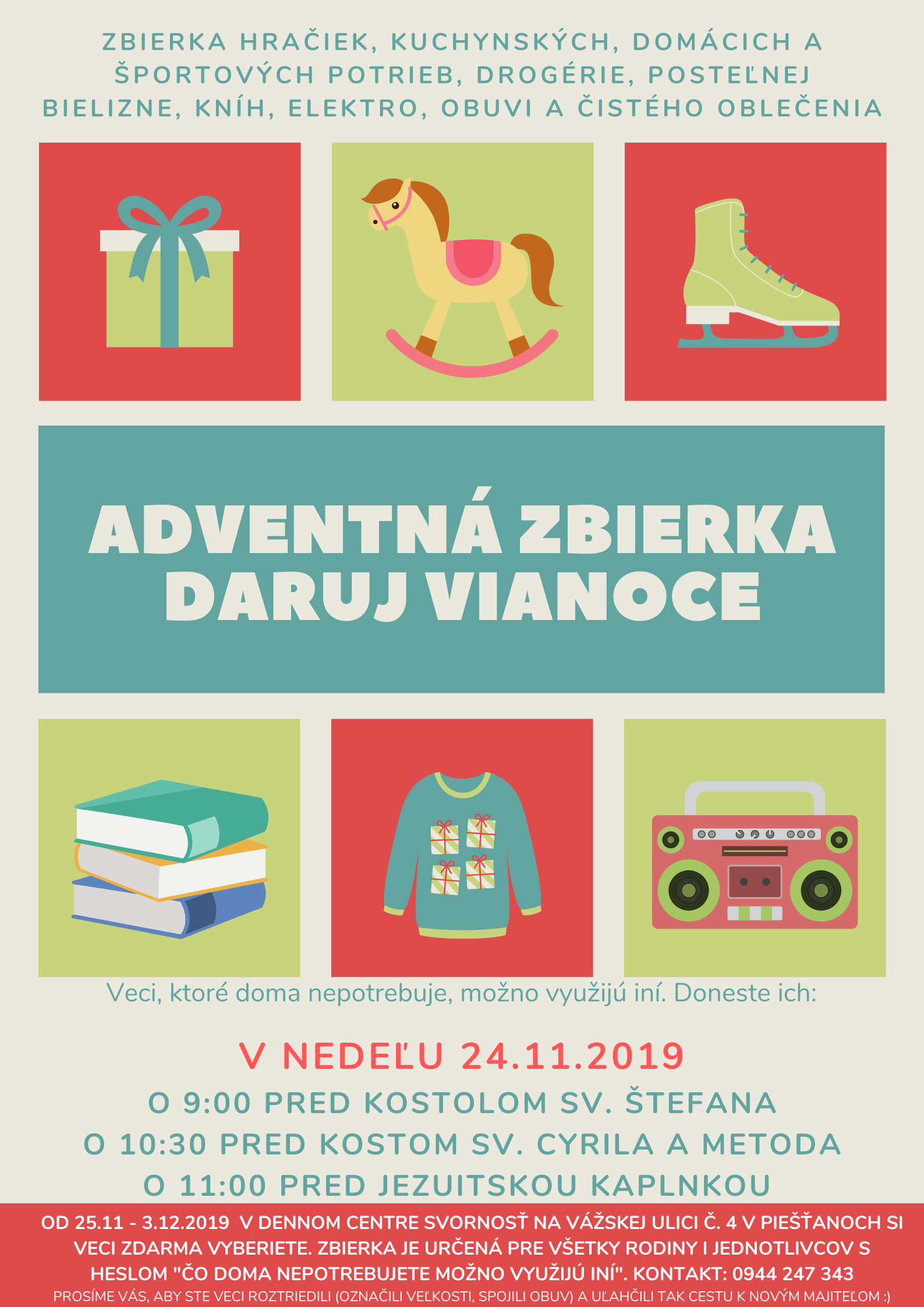 Už túto nedeľu sa pred piešťanskými kostolmi uskutoční zbierka hračiek, kuchynských a domácich potrieb, drogérie, kníh, elektroniky či nevynosenej obuvi a čistého oblečenia. Od pondelka 25. novembra sa prinesených vecí v priestoroch Denného centra Svornosť na Vážskej ulici č. 4 (oproti Kruhovke) vytvorí voľný bazár.