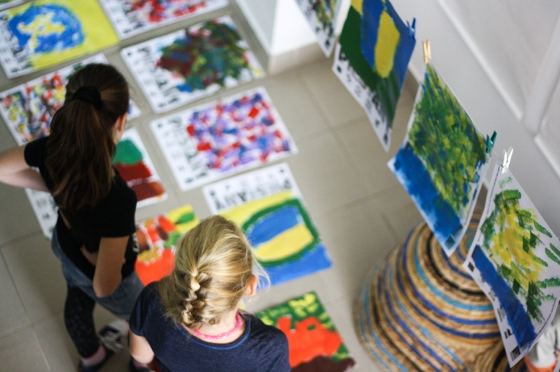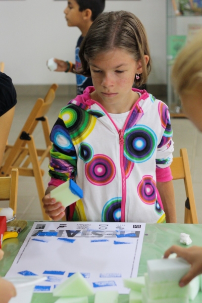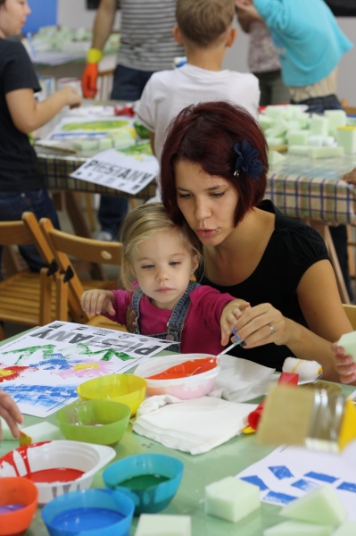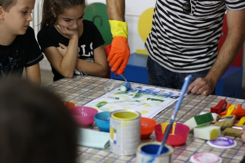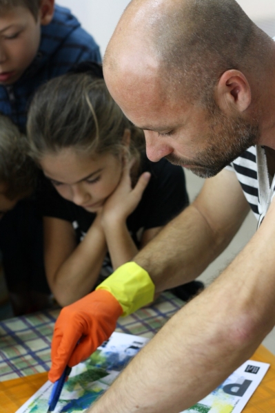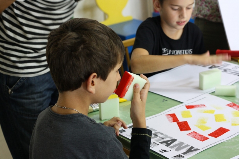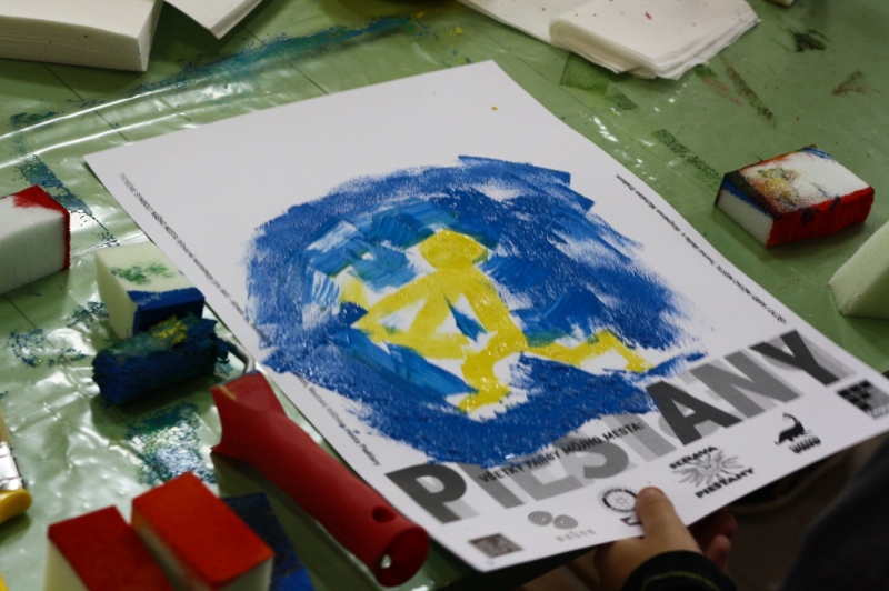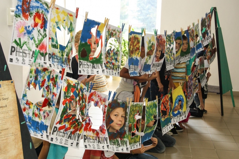 Tvorivé dielne, na ktorých deti maľovali plagáty so symbolmi a farbami nášho mesta, si vyskúšal dizajnér s malými umelcami po prvý raz. „Veľmi sa mi to páčilo, decká boli úžasné, vnímavé a kreatívne. Najskôr som im ukázal fotografie so symbolmi  mesta ako most, barlolámač, čajky, Sĺňava, park a podobne.“ Nakoniec si však podľa neho väčšina vybrala veveričky a lekná. Namiesto štetcov ich však maľovali špongiami. Michal si myslel, že ich táto technika zaujme viac a mal pravdu. Hoci vedeli, že k mestu patria žltá a modrá,  pripravené boli pre nich rôzne farby a tie deti aj náležite využili. Symboly nakoniec z obrázkov vyrezali a cez ne sa pozreli na svet. „Chcel som, aby videli obraz sveta aj z druhej strany, taká 2D imaginácia,“ vysvetľuje M. Staško. Výstavu kreatívnych detských plagátov si môžete pozrieť v Mestskej knižnici Piešťany.