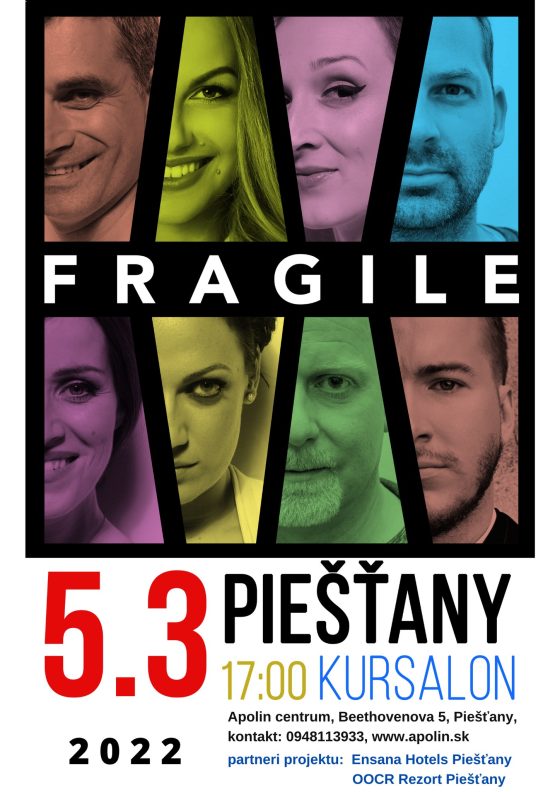 Už o necelý mesiac v sobotu 5. marca sa v Piešťanoch môžete tešiť na koncert FRAGILE vo Veľkej sále Kúpeľnej dvorany. Ide o známu slovenskú vokálnu skupinu zloženú z populárnych osobností, známych z rôznych televíznych seriálov, divadelných, muzikálových produkcií či TV šou.