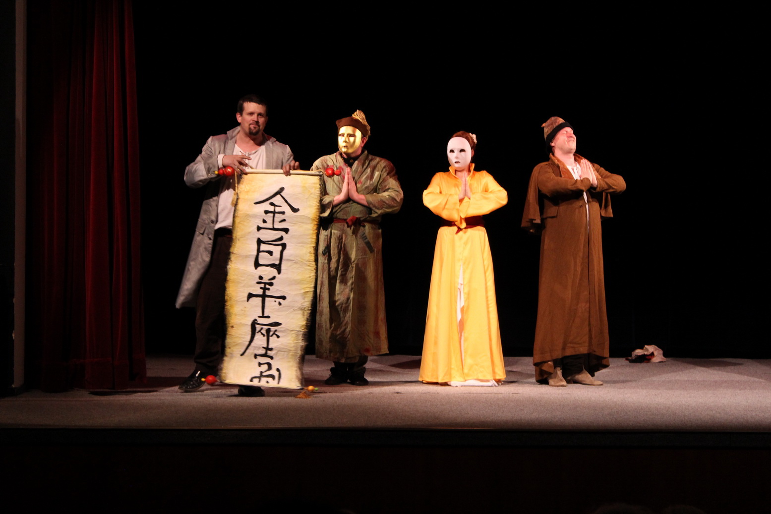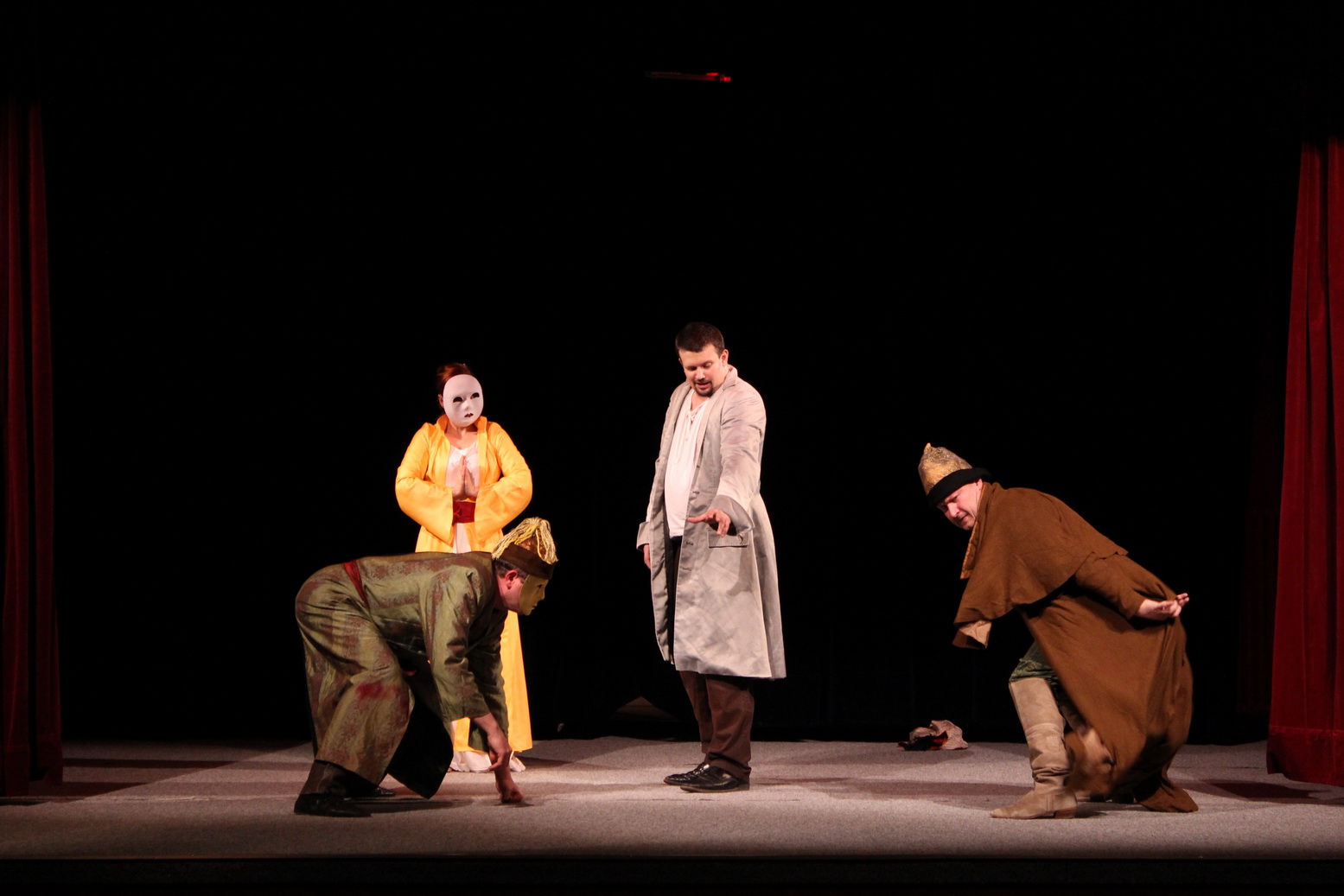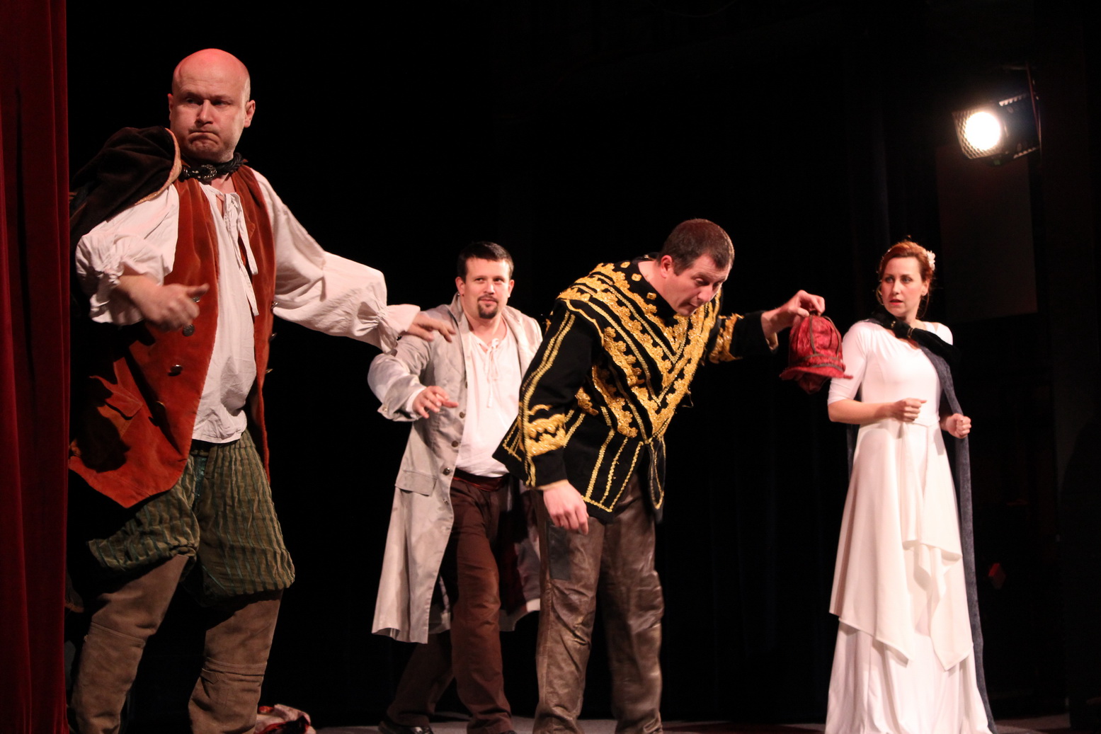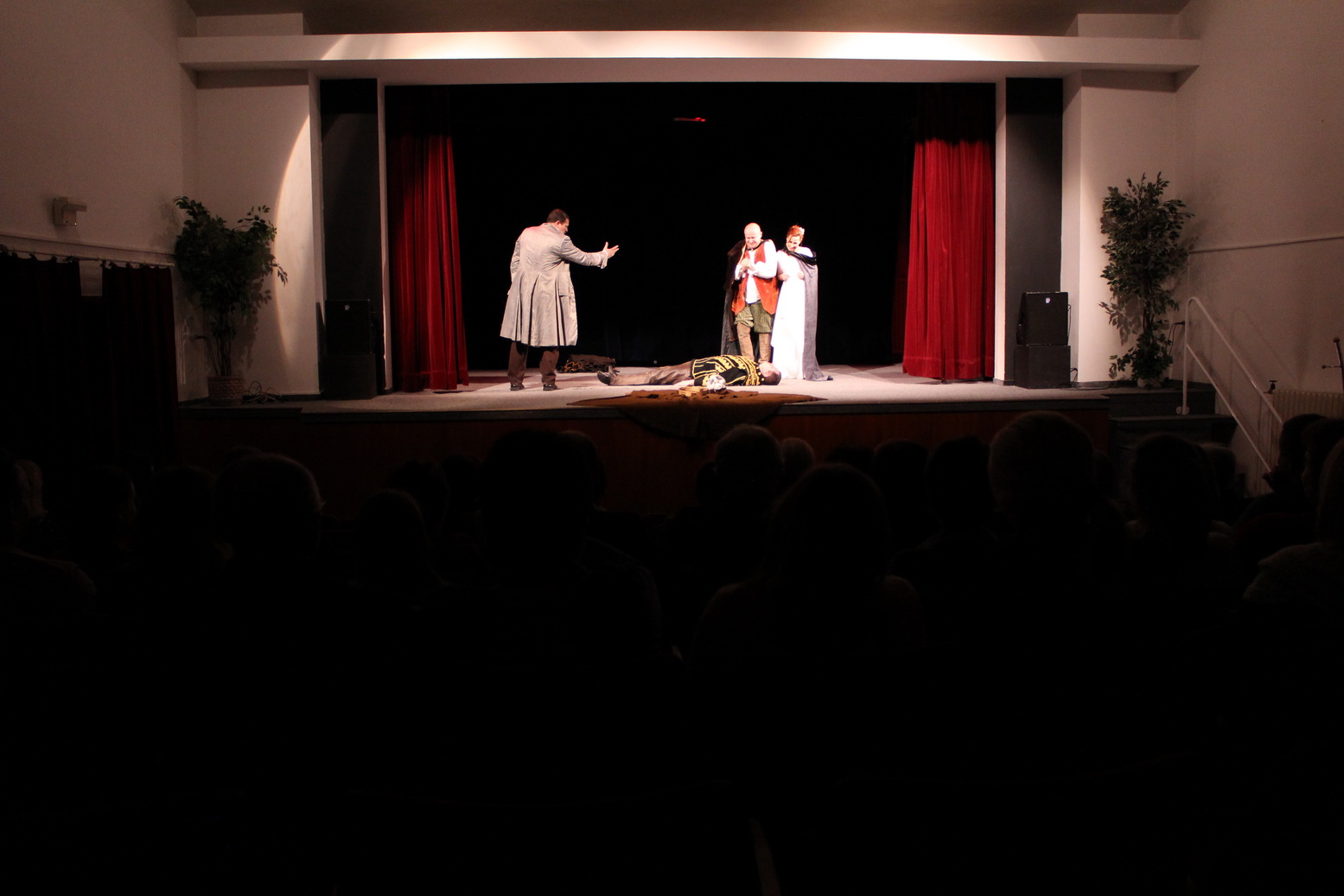 Celá hra je v aranžmáne pre štyri postavy, v ktorých sa predstavili autor Jakub Nvota, Pavol Buocik, Štefan Richtárech a Zuzka Kyzeková. V priestoroch sály sa na ňom zišli štyri desiatky divákov a určite neľutovali. Predstavenie bolo veľmi živé, jedna humorná situácia striedala druhú, pohybové gagy dopĺňali slovné vtipy. Zaznela angličtina, ruština, ale aj vymyslená úprava mongolčiny a japončiny. Vynikajúca bola dabovaná scéna rozhovoru Hamleta s Oféliou, za ktorou v ničom nezaostal ani záverečný šermiarsky výstup.