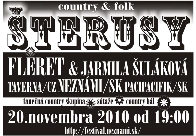 Dvanásty ročník festivalu Country a Folk Šterusy sa uskutoční 20.novembra 2010 v Kultúrnom dome v Šterusoch. V programe vystúpi kapela Taverna z Prostějova, domáci Neznámi a na country bále vás zabavia Pacipacifik zo Zvolena. Hviezdou večera bude vizovická skupina Fleret s legendárnou Jarmilou Šulákovou.