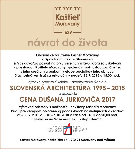 Občianske združenie Kaštieľ Moravany a Spolok architektov Slovenska pripravujú na prelom septembra a októbra výstavu, ktorá predstaví kolekciu architektonických diel Slovenská architektúra 1995 – 2015 a expozíciu Cena Dušana Jurkoviča 2017.