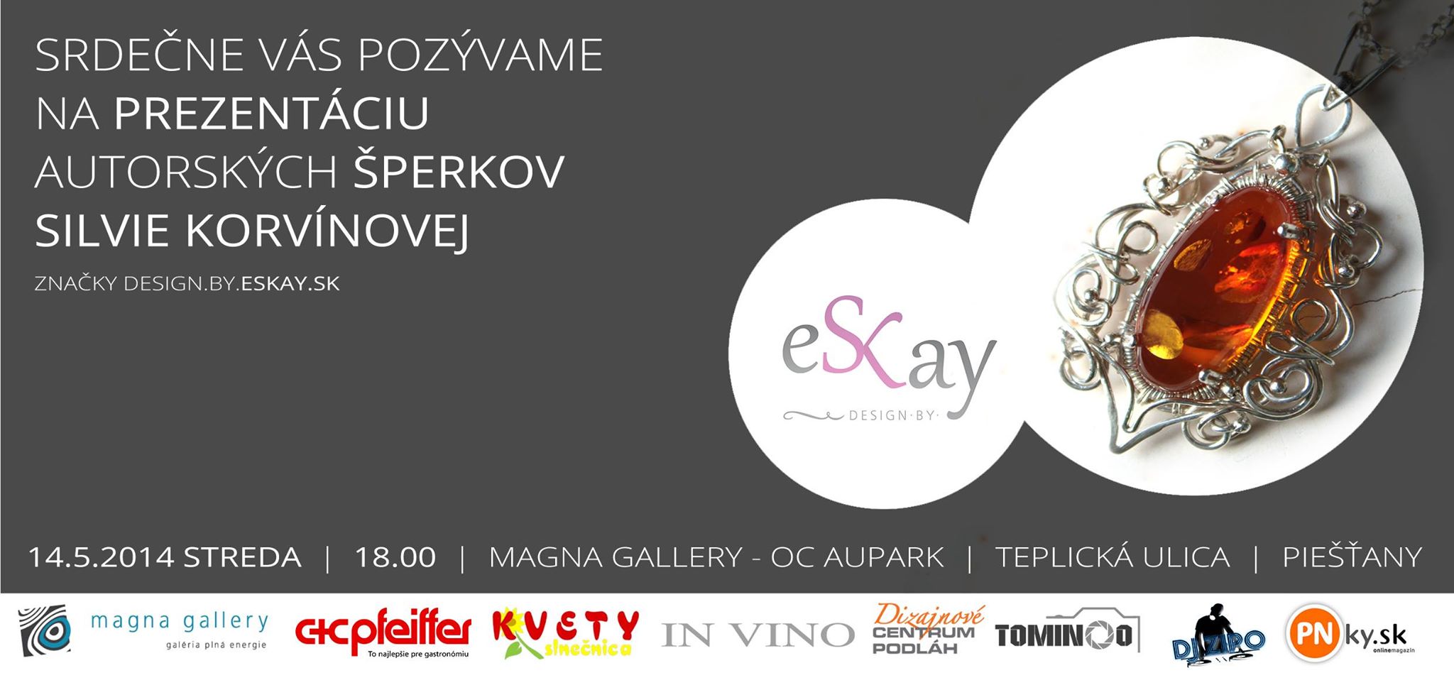 V stredu 14. mája o 18-tej podvečer sa v piešťanskej Magna gallery uskutoční netradičná jednorazová prezentácia šperkov značky design.by.eskay. Pod názvom design.by.eskay tvorí svoje dielka zo striebra a polodrahokamov piešťanská autorka Silvia Korvínová, ktorá s galériou spolupracuje už dlhšie.