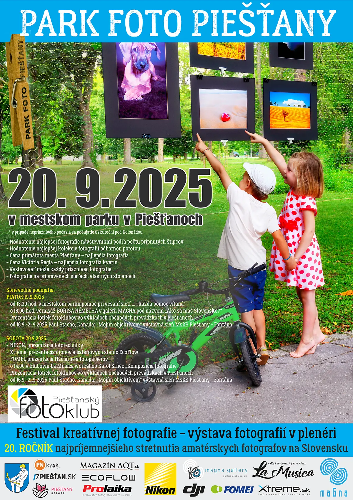Festival kreatívnej fotografie PARK FOTO PIEŠŤANY sa tento rok uskutoční už po dvadsiaty raz. Program je pri príležitosti jubilea širší ako zvyčajne. Aktuálne môžete vidieť vo výkladoch prevádzok pod Kolonádou prezentácie slovenských fotoklubov, v Magna Gallery má premiéru multimediálny projekt Borisa Németha „Ako sa máš Slovensko“, v KSC Fontána sú viaceré výstavy a v sobotu 20. septembra je naplánovaná prezentácia fototechniky, či workshop o kompozícii. Najväčším zážitkom však stále zostáva prezentácia stoviek fotografií v aleji Mestského parku.