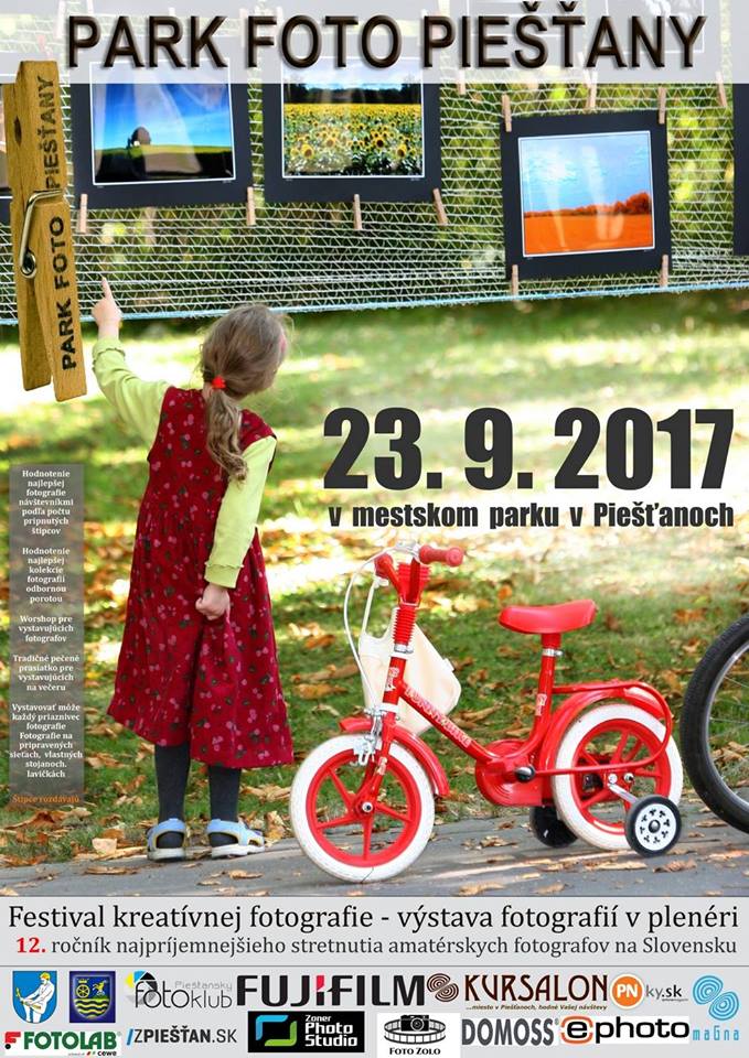 Mestský park v Piešťanom bude v sobotu 23. septembra dejiskom 12. ročníka podujatia PARK FOTO Piešťany, ktoré nesie podtitul festival kreatívnej fotografie. Návštevníkov čakajú stovky zaujímavých fotografií, tradičné hlasovanie pomocou štipcov, fotograf Martin Farkaš porozpráva svoje zážitky a premietne nevšedné zábery prírody. Začiatok je naplánovaný už na 9.00 hodinu a počas celého dňa si budú môcť záujemcovia môcť zoznámiť s produktami alebo vyskúšať objektívy a fotoaparáty z požičovne.