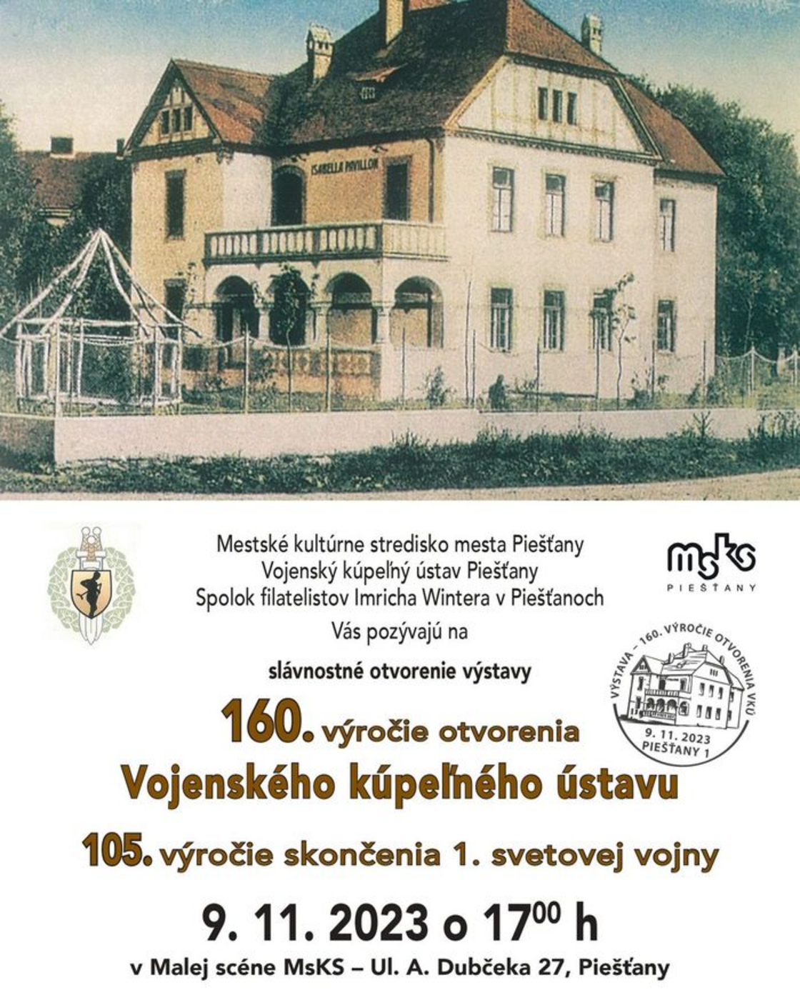 Tento rok uplynulo 160 rokov od otvorenia Vojenského kúpeľného ústavu. Vo štvrtok 9. novembra bude pri tejto príležitosti v priestoroch Malej scény MsKS na ulici A. Dubčeka v Piešťanoch otvorená výstava zastrešená Spolkom filatelistov Imricha Wintera. Výstava pripomenie tiež 105. výročie skončenia 1. svetovej vojny.