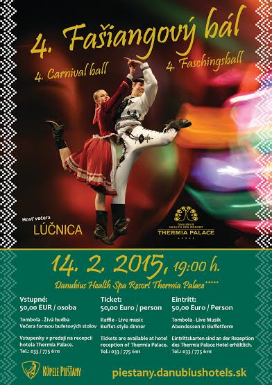 Fašiangy na Slovensku sa od dávnej minulosti nesú v znamení ľudových zábav, veselosti, hier a maškarád. V sobotu 14. februára 2015 sa bude plesať na ľudovú nôtu na 4. fašiangovom bále v piešťanských kúpeľoch, v prekrásnom prostredí secesného hotela Danubius Health Spa Resort Thermia Palace*****. Špeciálnym hosťom večera je umelecký súbor Lúčnica.