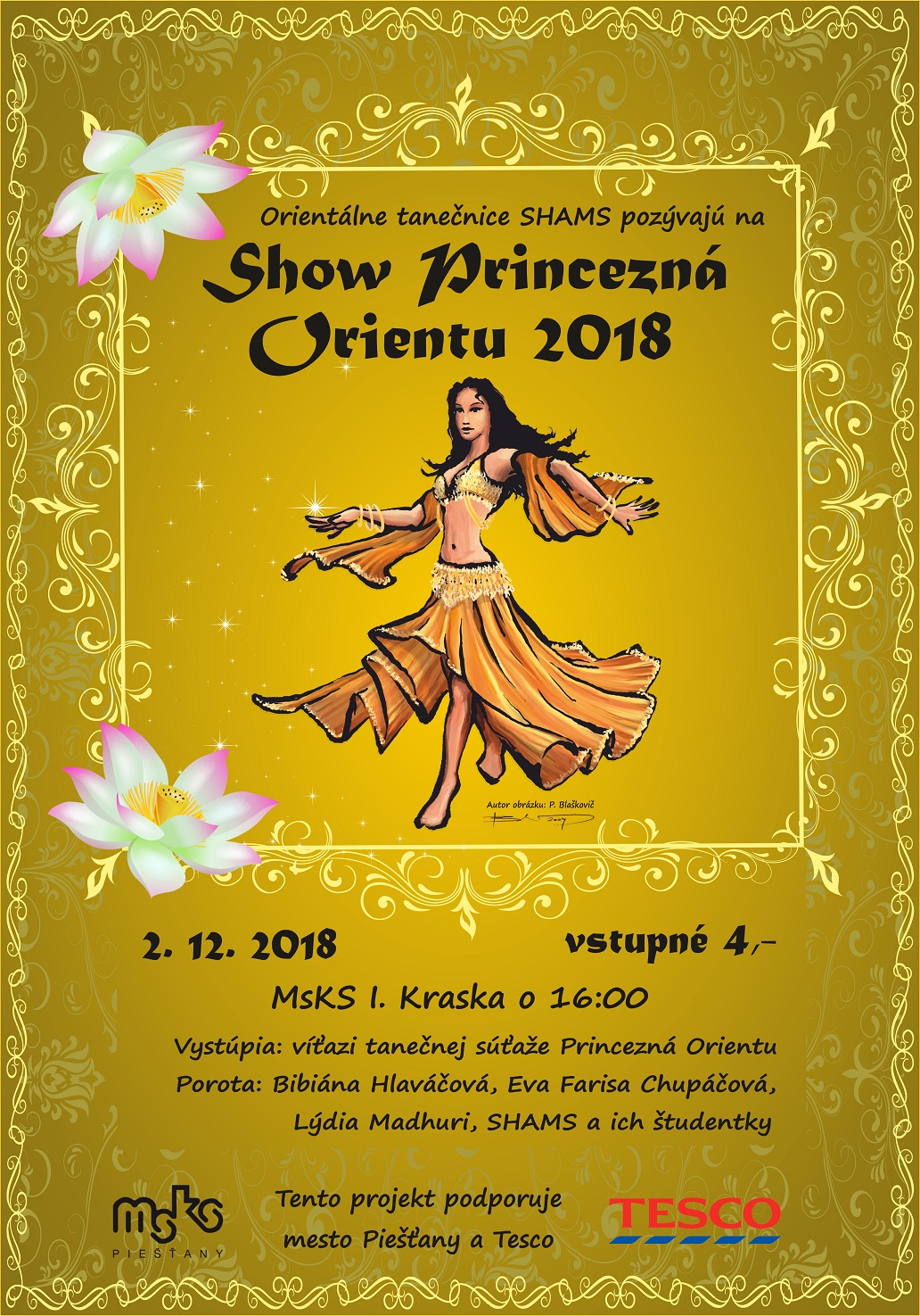 Všetkých priaznivci tanečného umenia sú po súťaži o 16:00 h pozvaní na tanečnú show Princezná Orientu. Počas tohto jedinečného podujatia budete mať možnosť si vychutnať tance z celého sveta. Predstavia sa vám profesionálne tanečnice Bibiána Hlaváčová (Orientalico), Eva Farisa Chupacova (ISHTAR – Belly dance group), Lýdia Madhuri, víťazné skupiny a sólistky tanečnej súťaže Princezná Orientu, absolventky tanečných kurzov a samozrejme organizátorky – Orientálne tanečnice SHAMS
