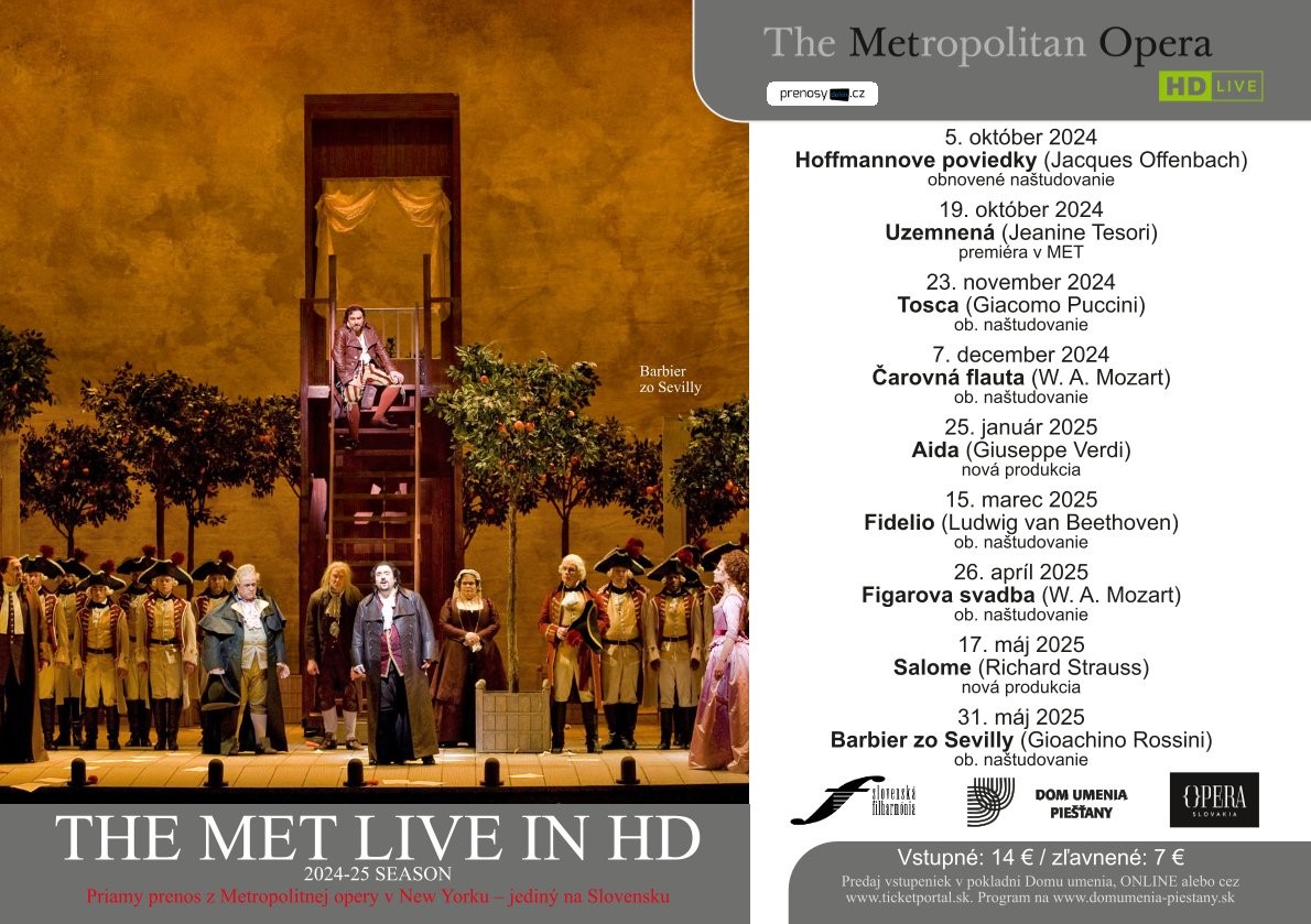 Sezóna priamych prenosov z Metropolitnej opery v New Yorku The Met: Live in HD bude pokračovať v sobotu 23. novembra 2024 o 18:55 ďalším atraktívnym titulom. Dom umenia Slovenskej filharmónie v Piešťanoch ako jediná inštitúcia na Slovensku uvedie Pucciniho legendárnu operu Tosca opäť v hviezdnom obsadení.