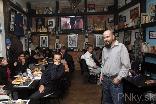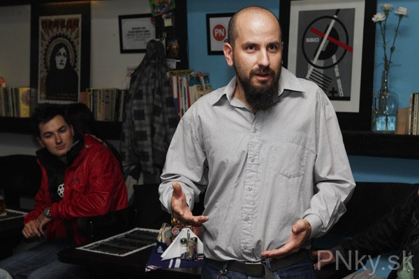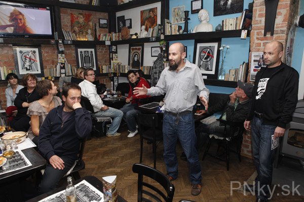 Pokračoval rozprávaním o hudbe, ktorá mala dôležité miesto pri procese tvorby väčšiny vystavených diel. „Má veľmi rád slovenskú a českú muziku a hlavne punk. Bol jedným z prvých piešťanských punkáčov a tiež členom Podjavorinskej anarchistickej spoločnosti. Asi tri mesiace dokonca robil DJ v texaskom ilegálnom rádiu. Púšťal tam česko-slovenskú punkovú hudbu, až pokým rádio nenašli a nezavreli.“