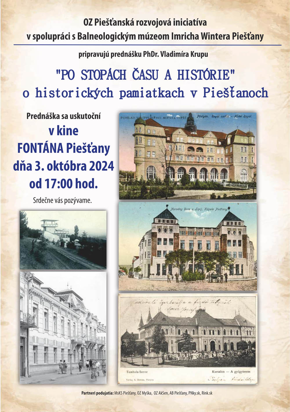 Občianske združenie Piešťanská rozvojová iniciatíva v spolupráci s Balneologickým múzeom Imricha Wintera Piešťany pripravili na štvrtok 3. októbra 2024 prednášku PhDr. Vladimíra Krupu „PO STOPÁCH ČASU A HISTÓRIE“ o historických pamiatkach v Piešťanoch.