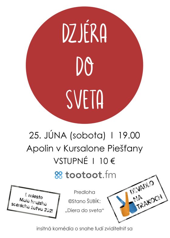 Kto z ľudí by nechcel „urobiť dieru do sveta“? Dobre, nájdu sa aj takí. Avšak tých, čo sa chcú ukázať v čo najlepšom svetle, je zrejme viac. Ak máte chuť na dobrú zábavu, nenechajte si ujsť insitnú komédiu o snahe ľudí zviditeľniť sa, s názvom „Dzjéra do sveta“, ktorú do Piešťan prináša Divadlo na TrakOch.