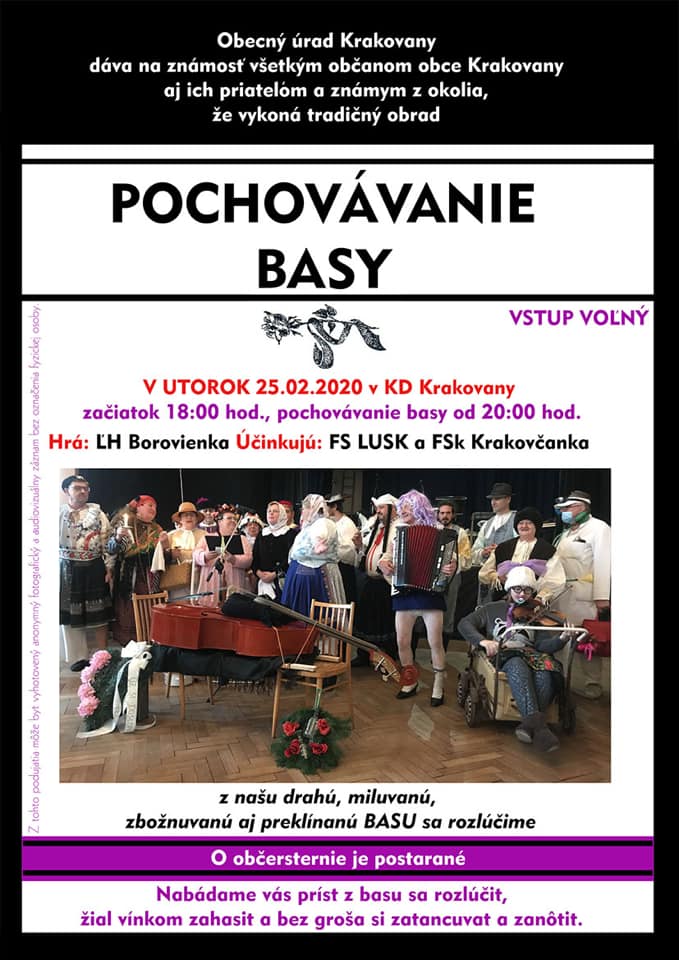 Tradičné pochovávanie basy na konci fašiangového obdobia sa dnes v utorok 25. februára uskutoční v Krakovanoch v Kultúrnom dome. Hrať bude Ľudová hudba Borovienka a účinkovať Folklórny súbor LUSK a Folklórna skupina Krakovčanka. Podujatie začína o 18:00 h. Samotné pochovanie basy je naplánované na 20:00 h. Zabaviť sa v posledný deň obdobia veselosti môžete prísť aj vy, vstup je voľný.