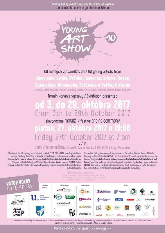 Do Piešťan zavíta začiatkom októbra už desiata YOUNG ART SHOW, ktorá predstaví diela 60 mladých výtvarníkov zo Slovenska, Česka, Poľska, Nemecka, Španielska, Rumunska, Srbska, Estónska, Ruska a Veľkej Británie. Expozícia vo výstavných priestoroch Domu umenia bude sprístupnená už od utorka 3. októbra, záverečná Slávnostná finisáž sa bude konať v piatok 27. októbra o 19.00 hodine vo Veľkej sále Domu umenia. Na pripravovanej módnej prehliadke predvedú svoje kolekcie módni dizajnéri Petra Kovacs, Tatiana Ďurkovová, Adela Babinská, Valéria Kršiaková a Ondrej Forus. Program bude obohatený vystúpením klaviristu Jána Raua a rappera VLADISA, návštevníci si budú môcť pochutiť na špecialitách pripravených študentami Hotelovej akadémie Ľudovíta Wintera.