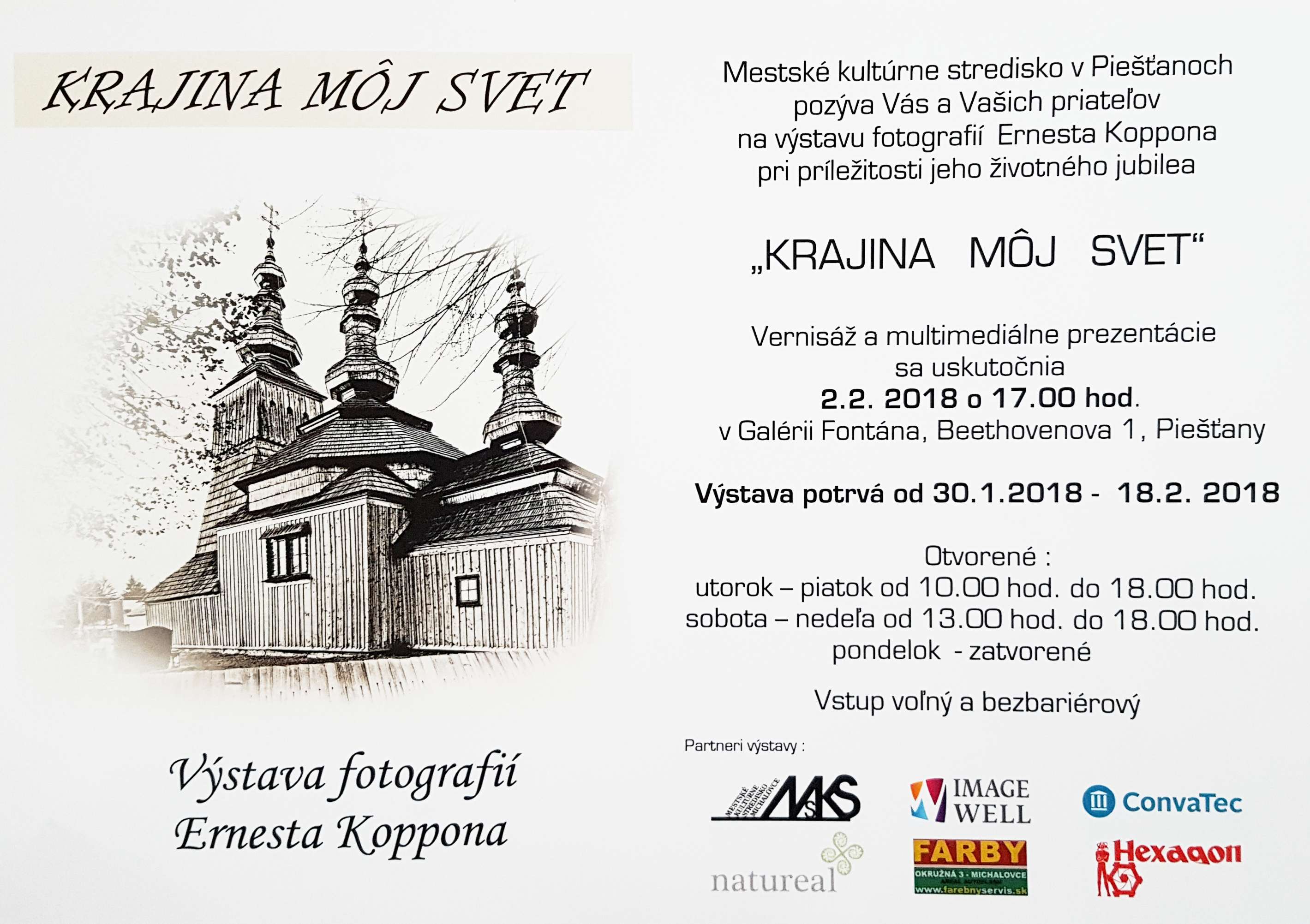 Mesto Piešťany a Mestské kultúrne stredisko mesta Piešťany pripravujú na piatok 2. februára vernisáž a multimediálnu prezentáciu fotografií Ernesta Koppona. Výstava organizovaná pri príležitosti jeho životného jubilea Krajina môj svet bude verejnosti prístupná v Galérii Fontána a potrvá do 18. februára. V priebehu najbližších mesiacov po jej skončení si budú môcť návštevníci priestorov postupne prezrieť obrazy Jaroslava Áča, Martina Georga Oscitého a Petra Žanonyho.