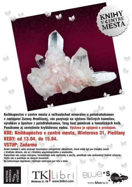 Výrobky a šperky z polodrahokamov, feng šuej pomôcky a drahé kamene budú vystavené od 13. do 15. apríla v Kníhkupectve v centre mesta (Winterova 31). Výstava je predajná a jej súčasťou budú aj tematické knihy.